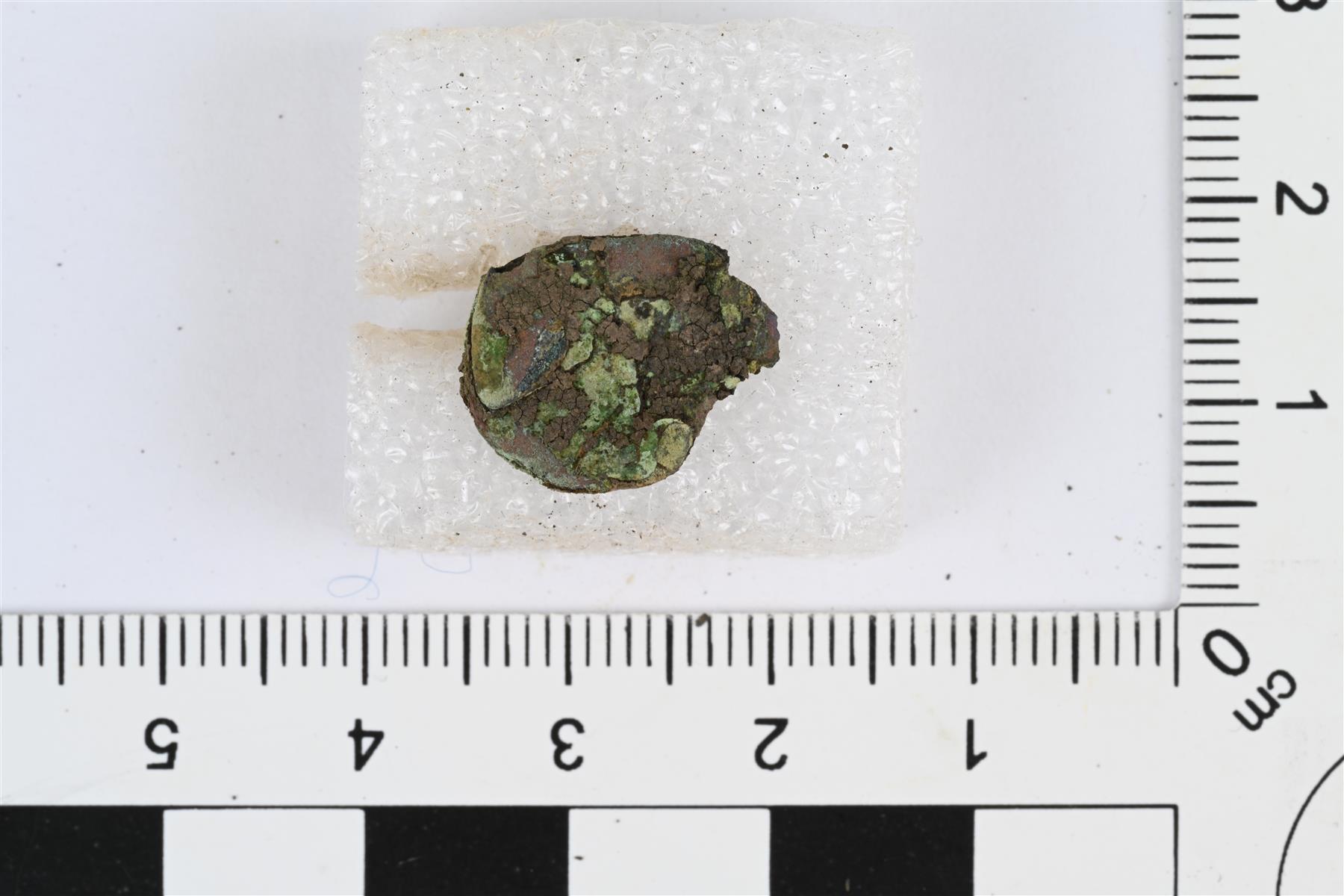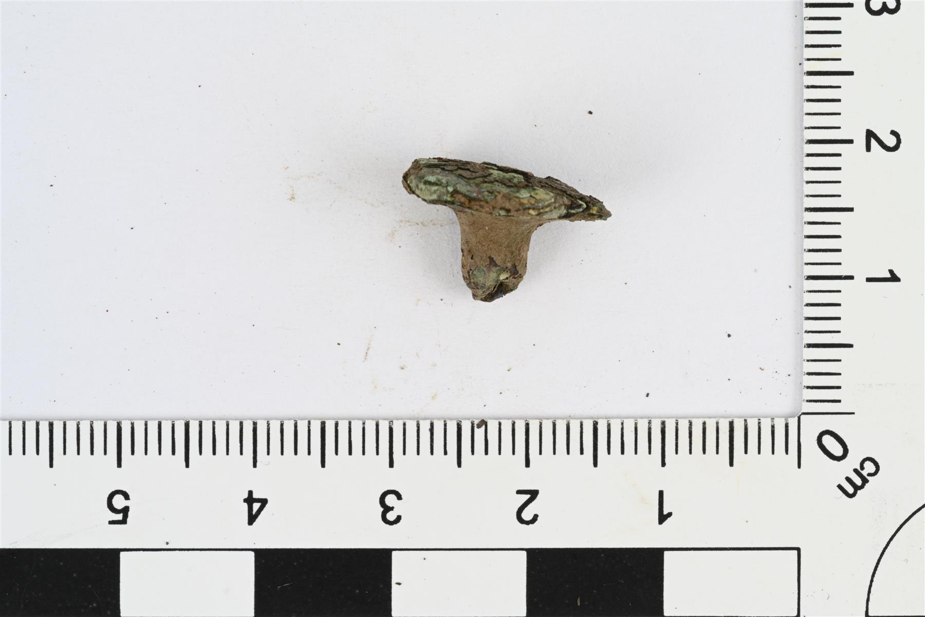 | Helan tms. katkelma. Katkelma litteästä esineestä, jonka toinen pinta hieman kupera ja toisella pinnalla tappi. | |