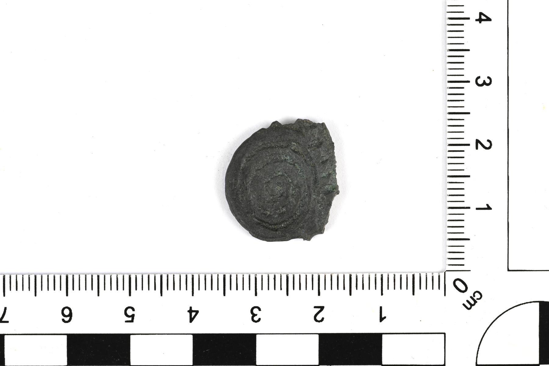| Ketjunkantajan pyöreän korvakkeen katkelma. Koristeluna on viivauurteella tehty spiraalikuvio. Vrt. Kivikoski Abb. 767 ja 1110. | |