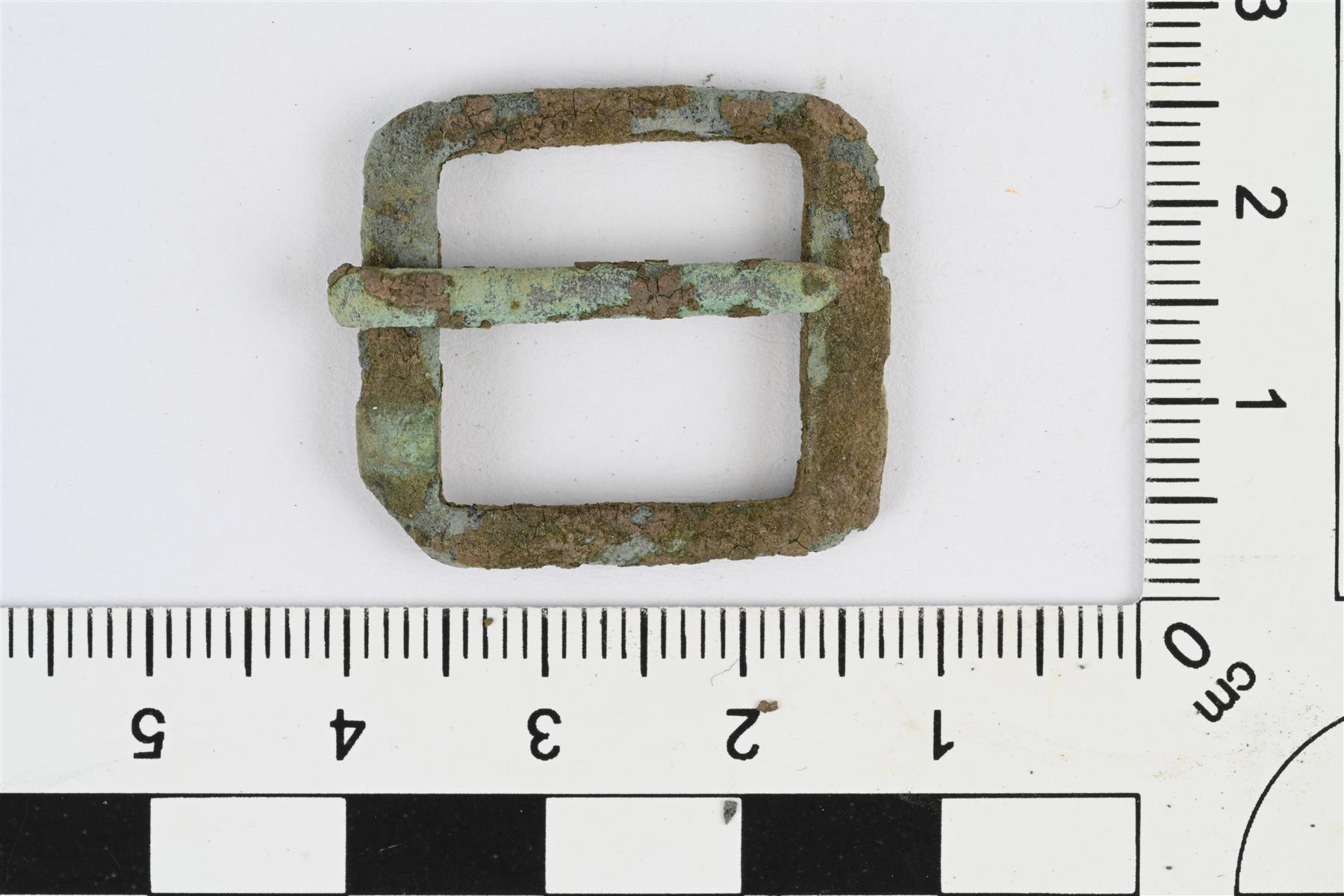 | Vyön- tai hihnansolki. Kulmista pyöristetyn suorakulmion muotoinen kehä. Lyhyet sivut leveämmät kuin pitkät sivut. Neulan tyvi on kierretty toisen lyhyen sivun ympärille. | |