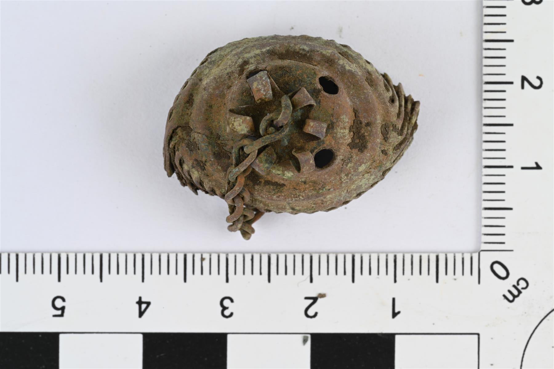| Kupera, melko ohuesta levystä tehty piipunhattu. Keskellä viisi reikää, joista keskimmäiseen on kiinnitetty ketju. Ketjun ja piipunhatun välissä on monihaarainen kukkamaiseksi taivutettu osa. Hatun alareuna on leikattu ohuiksi liuskoiksi. Hieman litistynyt. | |