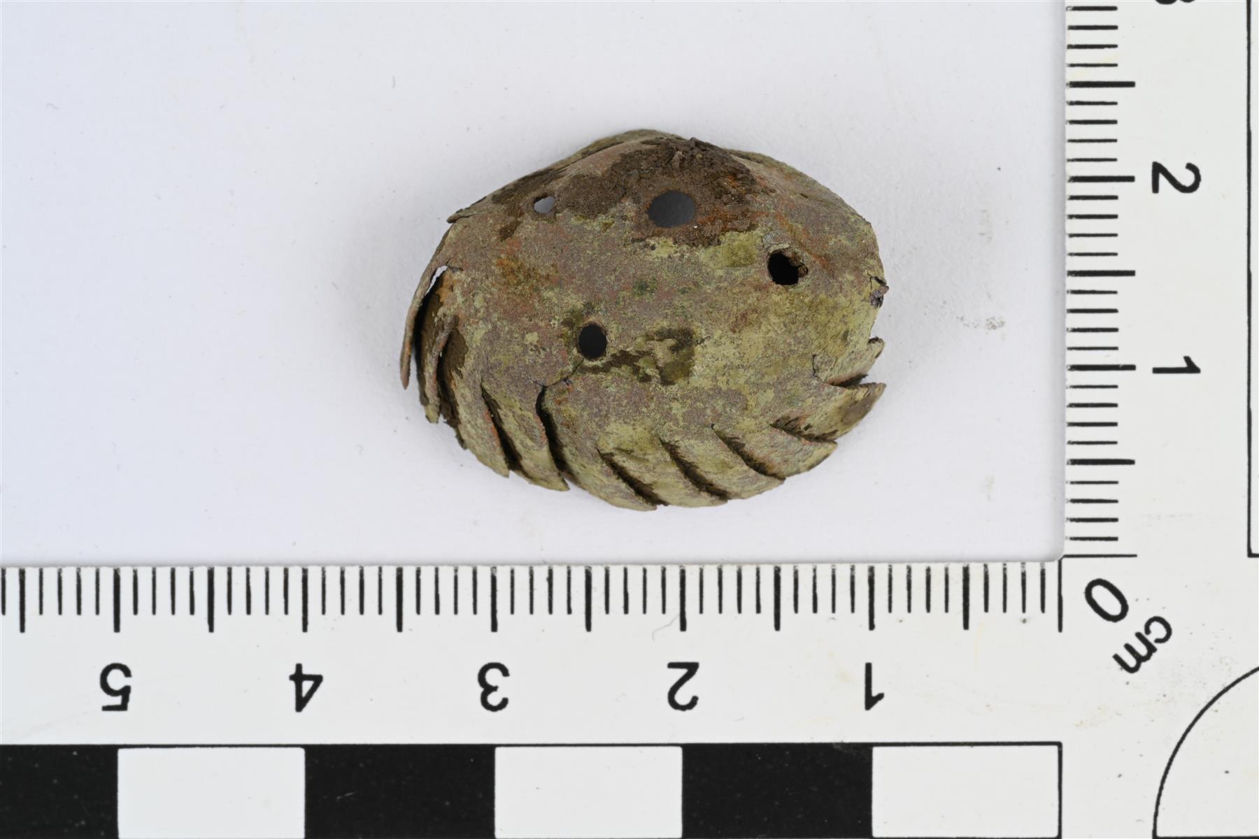 | Kupera, melko ohuesta levystä tehty katkelmallinen piipunhattu. Keskellä viisi reikää. Hatun alareuna on leikattu ohuiksi liuskoiksi. Alareunasta jäljellä alle puolet, muu osa murtunut pois. Hieman litistynyt. | |
