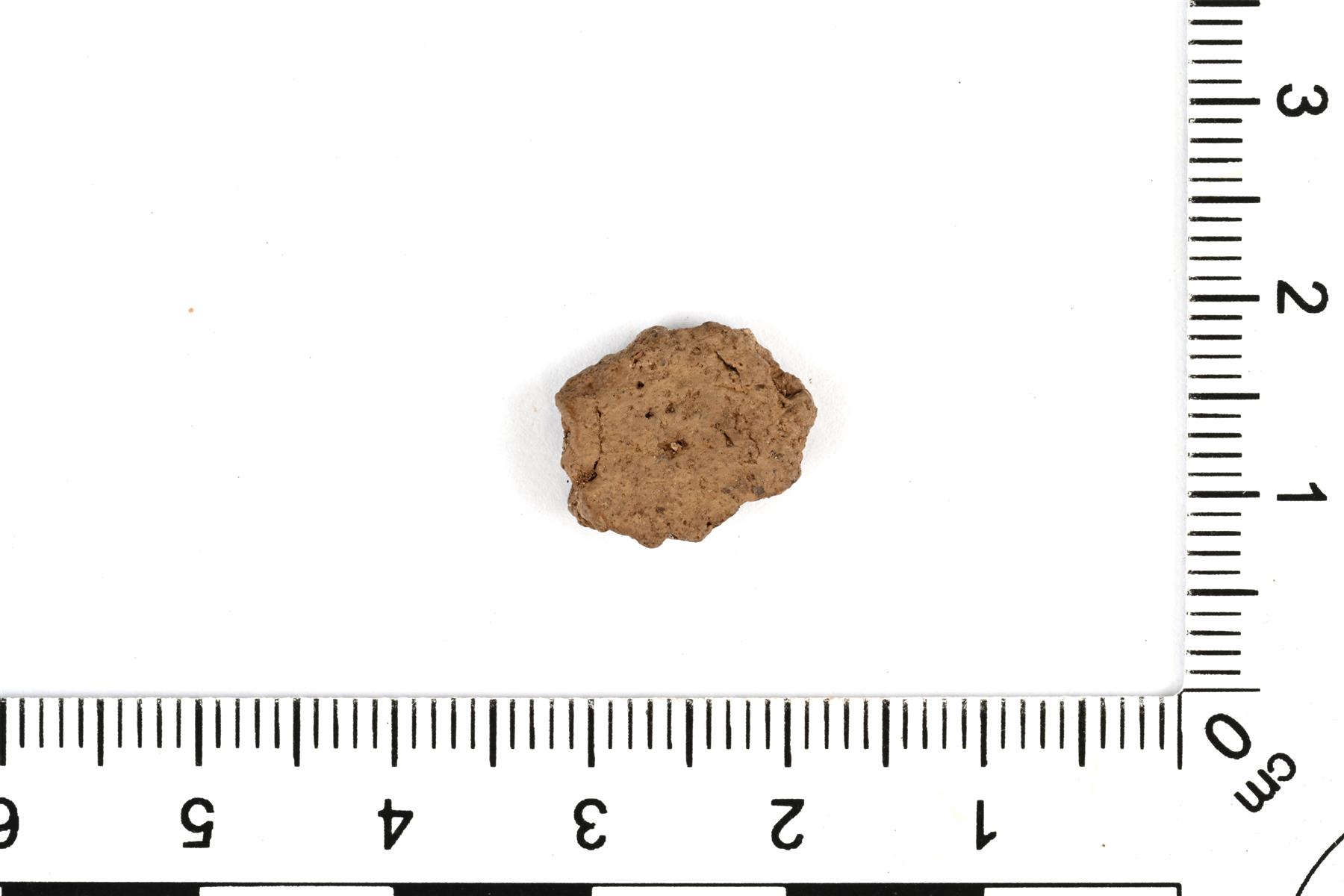 | Pikkuruinen keramiikan palanen. Säilynyt pinta on sileä. Väri on ruskea. | |