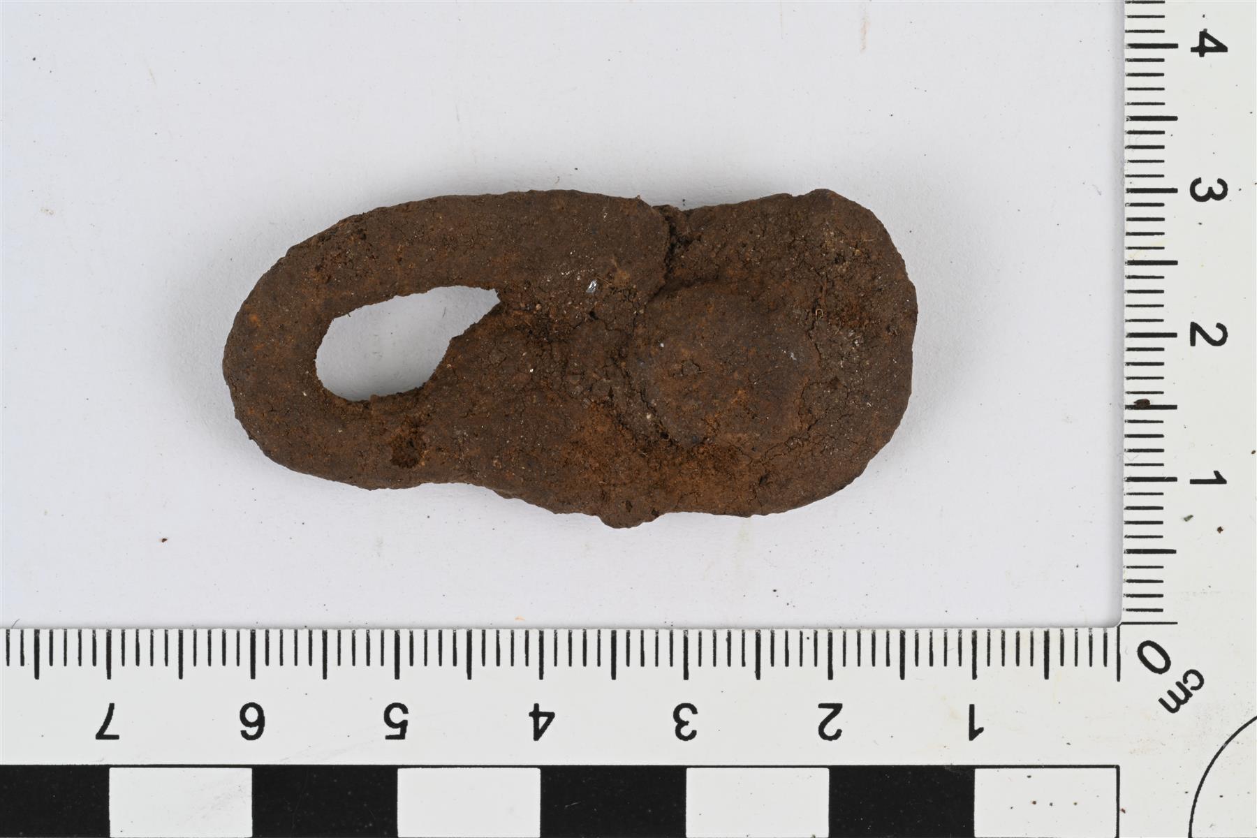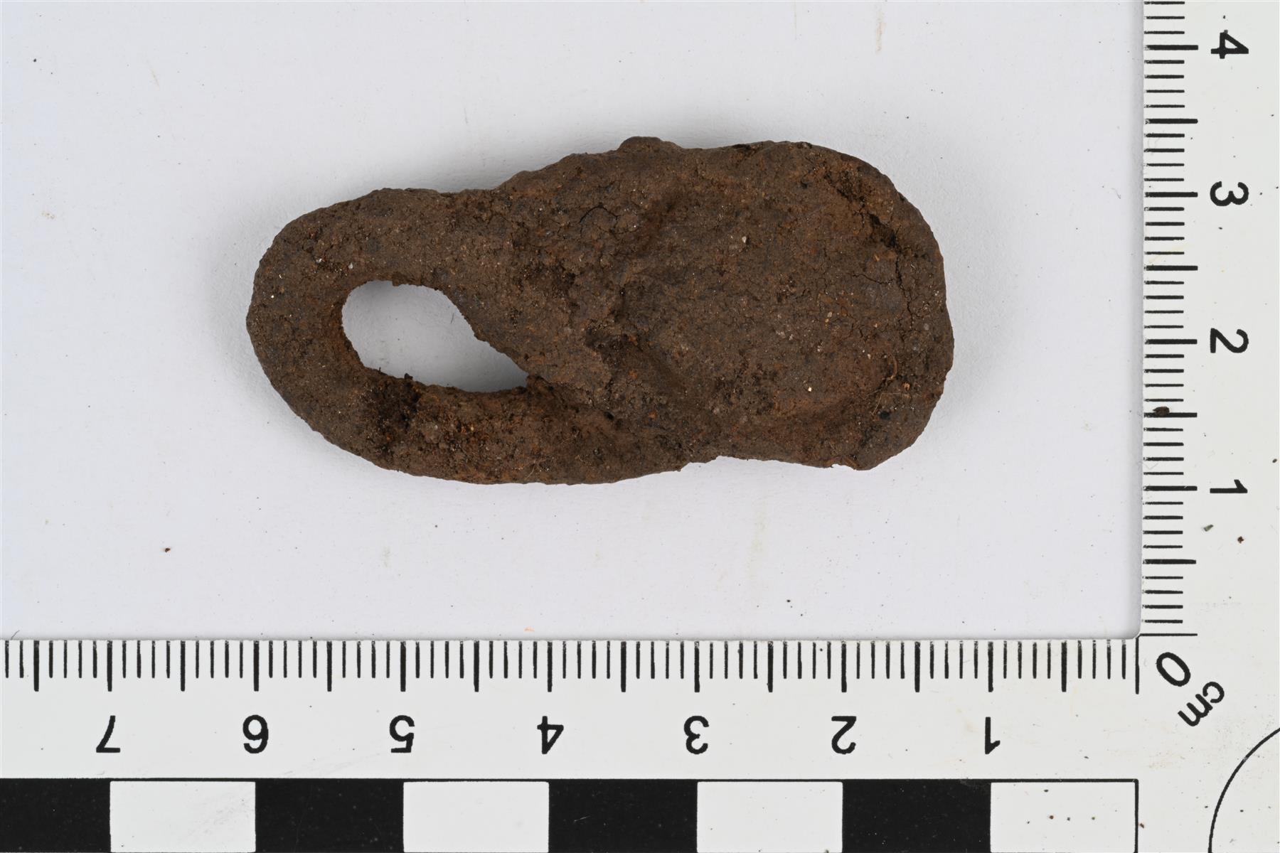 | Mahdollinen padan korvakkeen katkelma. Kaarelle taivutettu rautavartaan katkelma, jonka toinen pää katkennut, toinen pää ehjä, litistyvä ja pisaranmuotoinen, pään keskellä niitti. | |