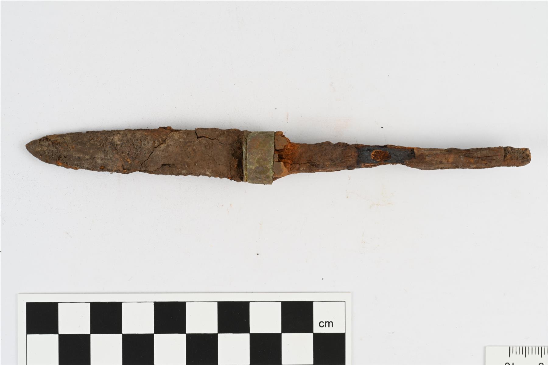 | Ruodollinen puukon tai veitsen terä. Terän ja ruodon välissä kupariseoksinen putkimainen hela. Hamara loivasti kupera, teränsuu ruodon puolelta suora tai lähes kovera ja kärjen puolleta kupera. | |