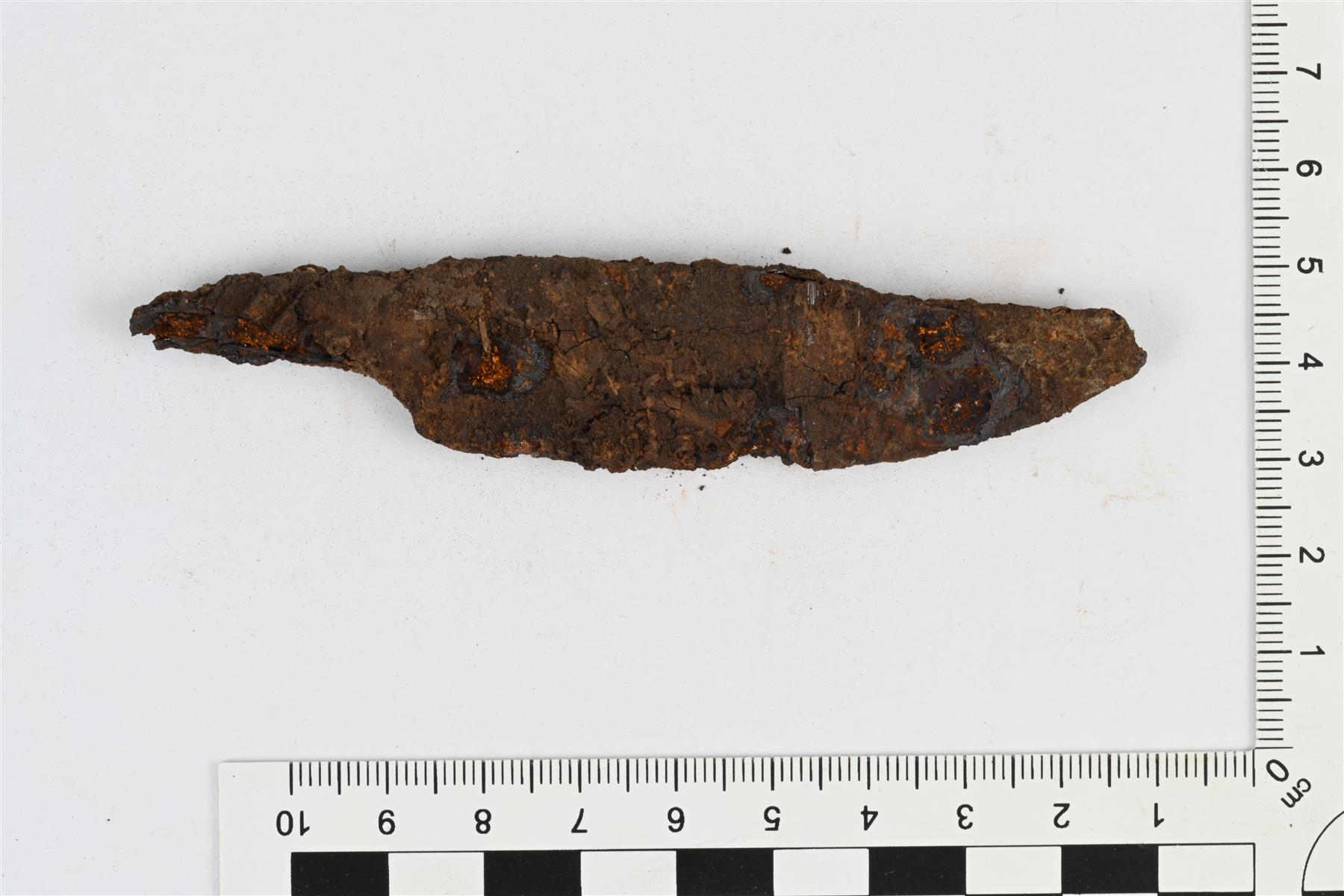 | Ruodollisen veitsenterän katkelma. Ruoto katkennut, samoin terän kärki. Hamara ruodon puolelta kupera ja kärjen puolelta kovera, teränsuu kupera. Ruoto jatkuu suoraan hamaraksi ilman olkaa, teränsuun puolella voimakas olka. | |