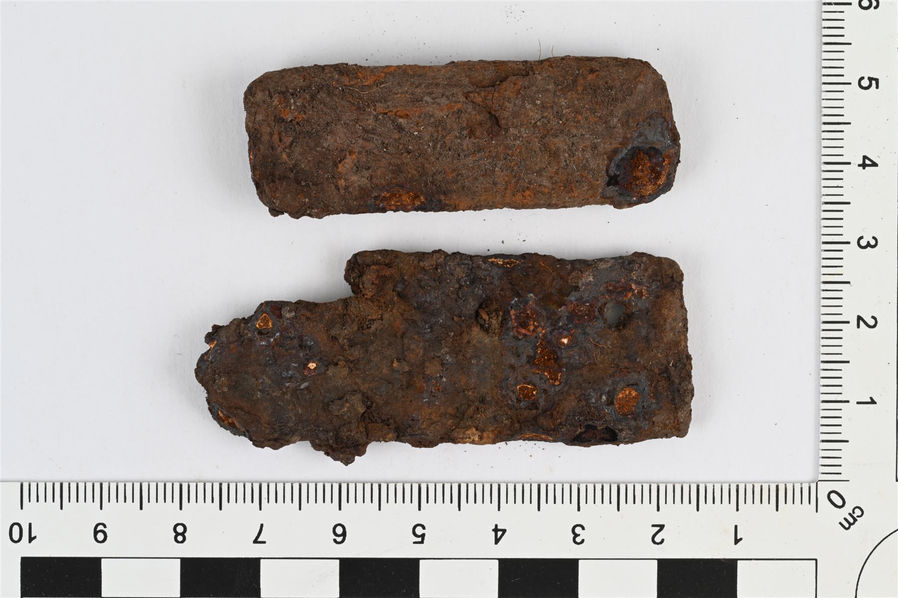 | Pitkänomaisia, litteitä, suorakulmaisia rautakatkelmia. Toisen päässä kaksi reikää, levyn mitat 62 x 24 x 4 mm. Toisen katkelman mitat 54 x 19 x 7 mm. | |