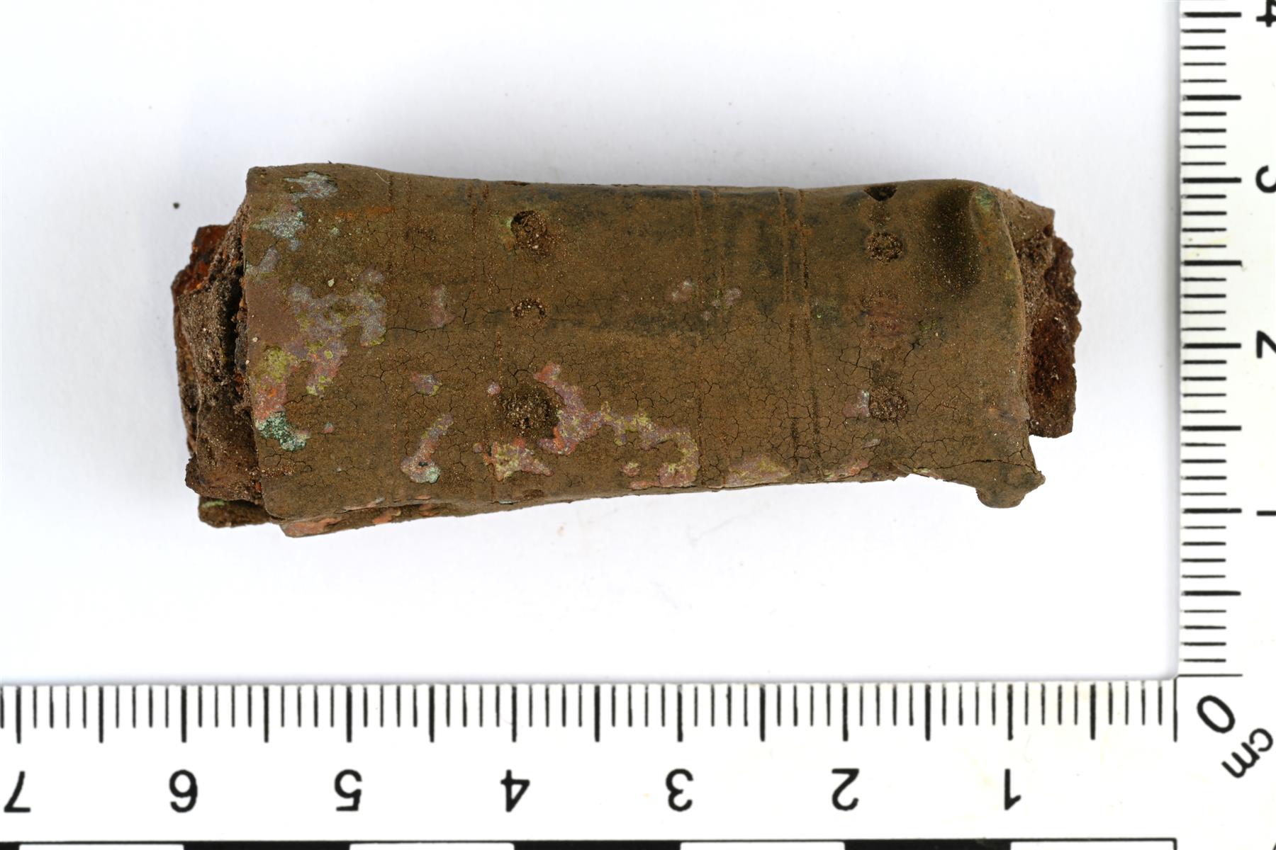 | Kupariseospellistä tehty veitsenkahva. Koristeluna poikittaisia viivauurteita. Sisäpuolella on säilynyt puuta ja rautaisen ruodon katkelma. | |