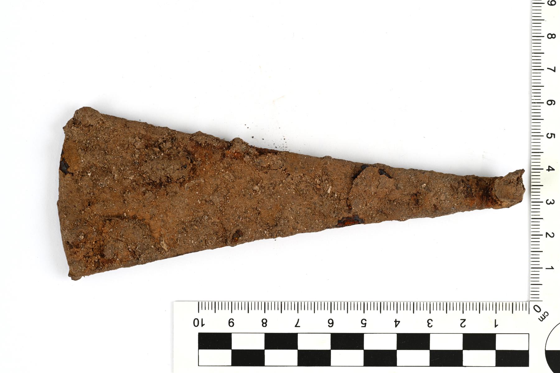 | Kaarevateräinen rautatyökalu. Levenee terää kohti ja ruodon kärki on taitettu. Teränsuu on teroitettu molemmilta puolilta. Todennäköisimmin nahantyöstöön käytetty terä tai kaavin. Toinen mahdollinen tulkinta on taltta. | |