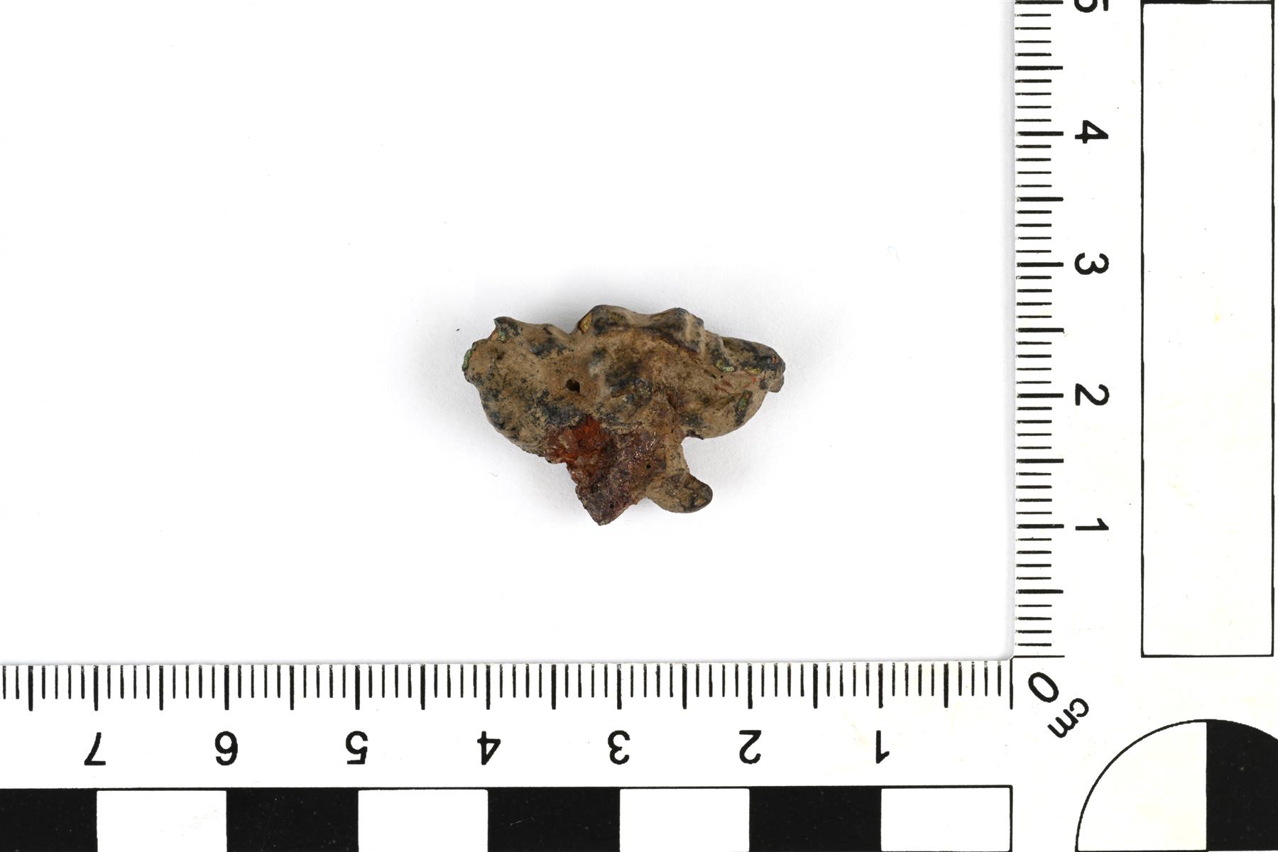 | Lähes täysin sulaneen tasavarsisoljen päädyn katkelma. Tunnistettavana on säilynyt osa soljen reunasta, jossa on koristeluna uritusta. Vastaa lähinnä ryhmää 7. Vrt. Kivikoski Fig. 14 ja 15. | |