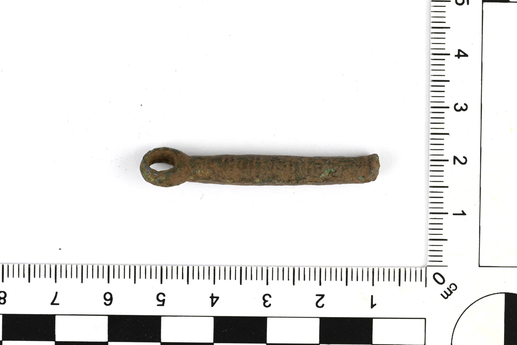 | Kankiketju, jonka toinen pää on hajonnut. Keskiosan poikkileikkaus on pyöreä. Koristeluna poikittaisia viivauurteita. | |