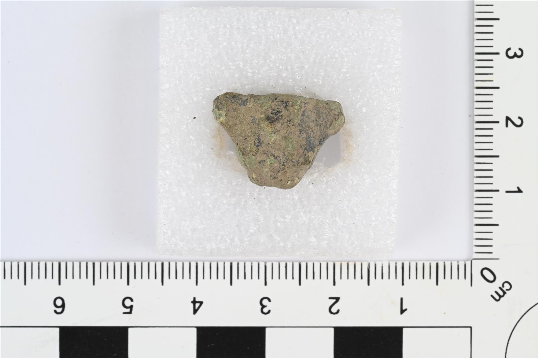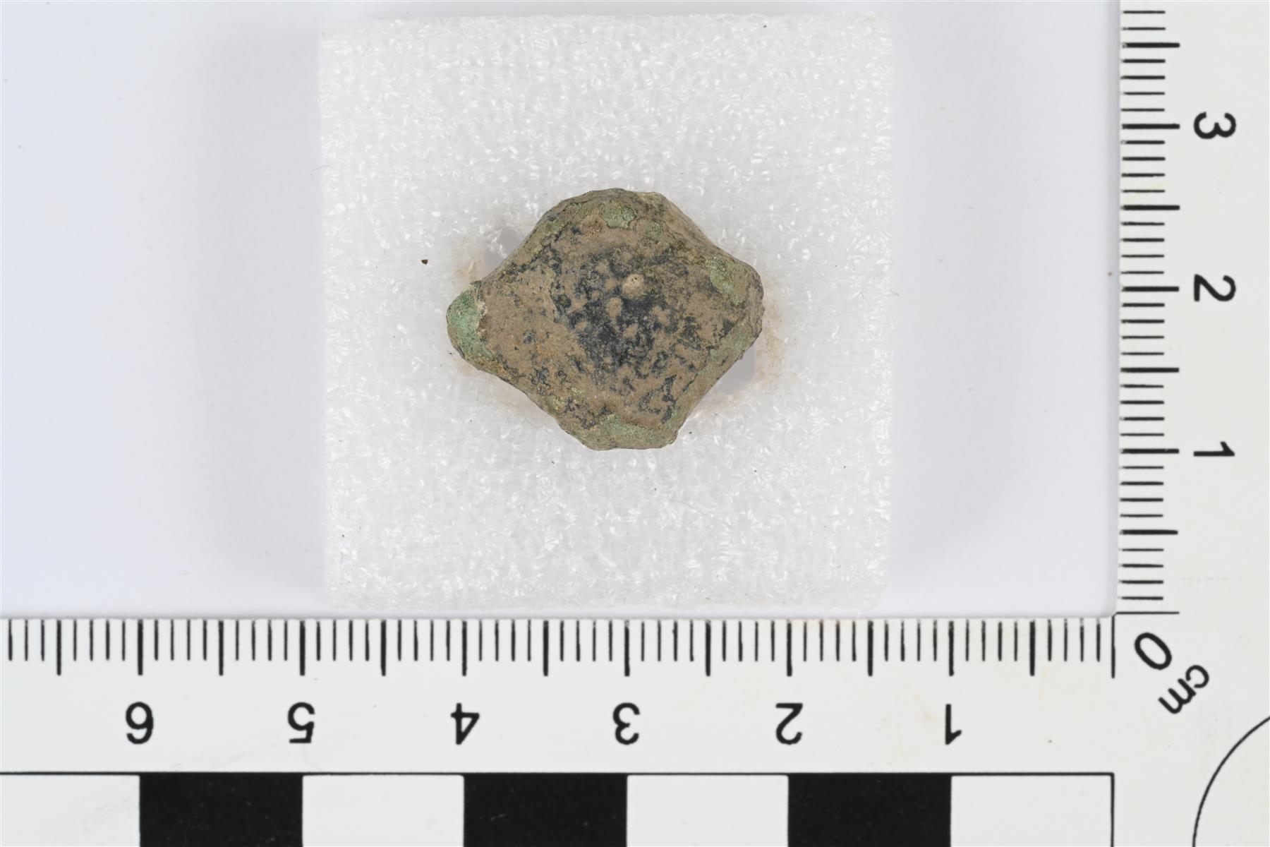 | Suppilonuppisen hevosenkenkäsoljen nuppi. Poikkileikkaus koverasivuisen vinoneliön muotoinen, nupin yläpinta tasainen. Osittain sulanut ja deformoitunut. | |