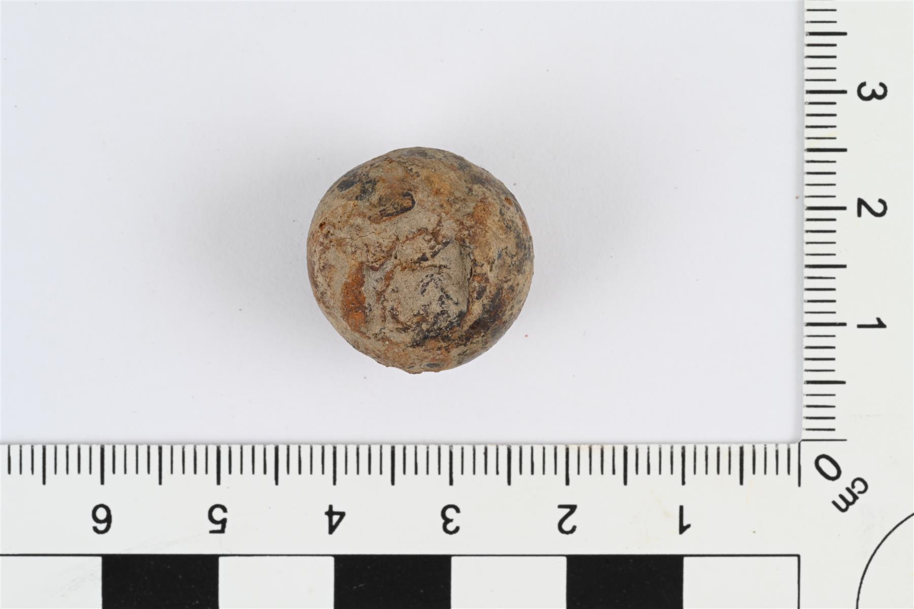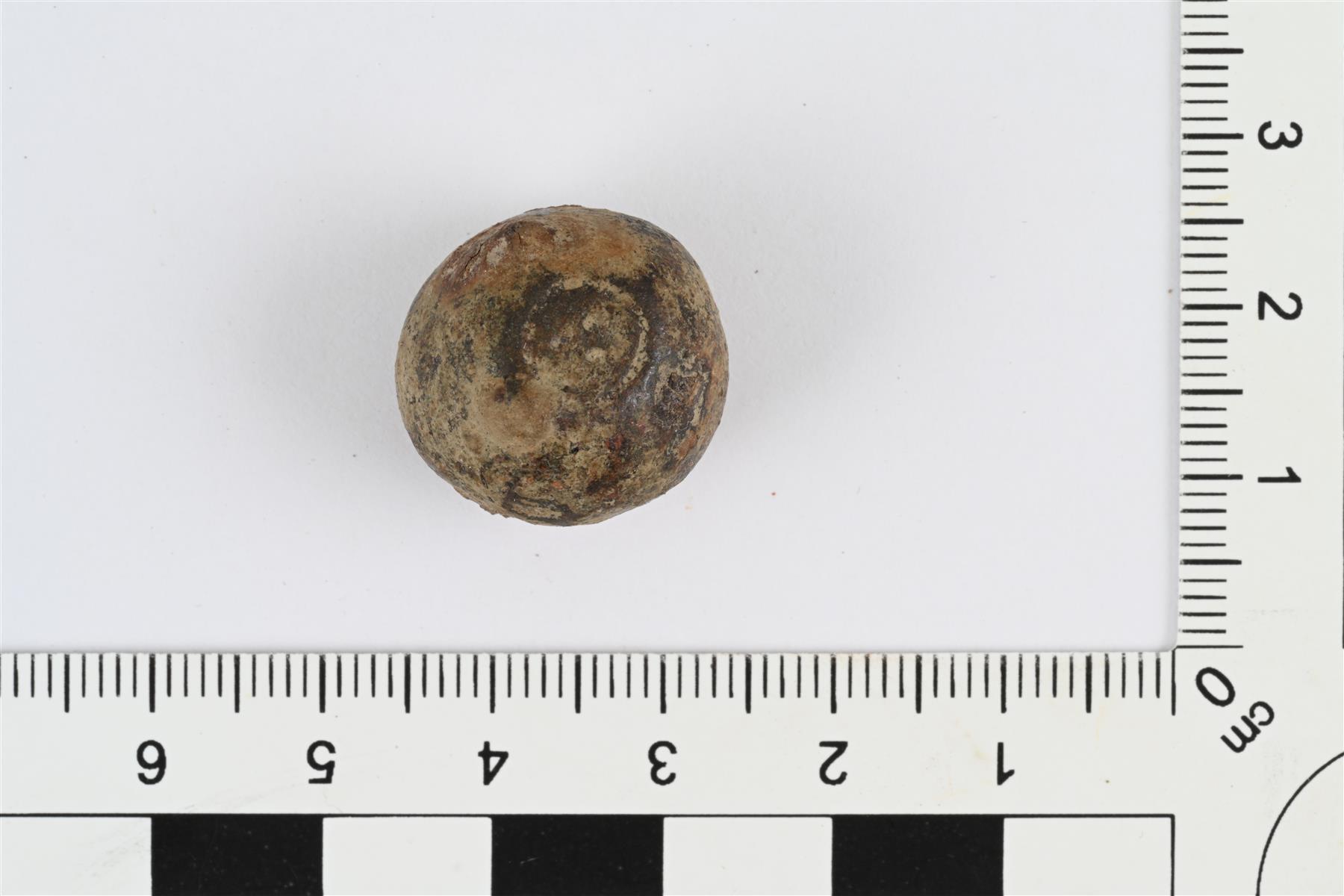 | Kuulamainen punnus. Kupariseosvaippa ja rautaydin, korrodoitunut rauta paikoin rikkonut kupariseospinnan. Toisessa tasaisessa laessa koristelua, jossa ympyrän sisällä kolme pistettä. Laen halkaisija noin 10 mm. Toinen laki korroosion vuoksi rikkoutunut. | |