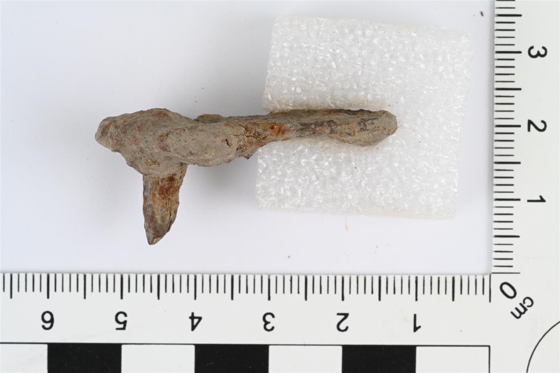 | Rautaesineen katkelma. Litteä ja pitkänomainen. Toinen pää katkennut. Toinen pää ehjä, levenevä ja pyöristyvä, ja sen toisella pinnalla lyhyt piikki. Piikki on mahdollisesti esineen pään läpi lyöty naula. Mahdollisesti jokin hela tms. | |