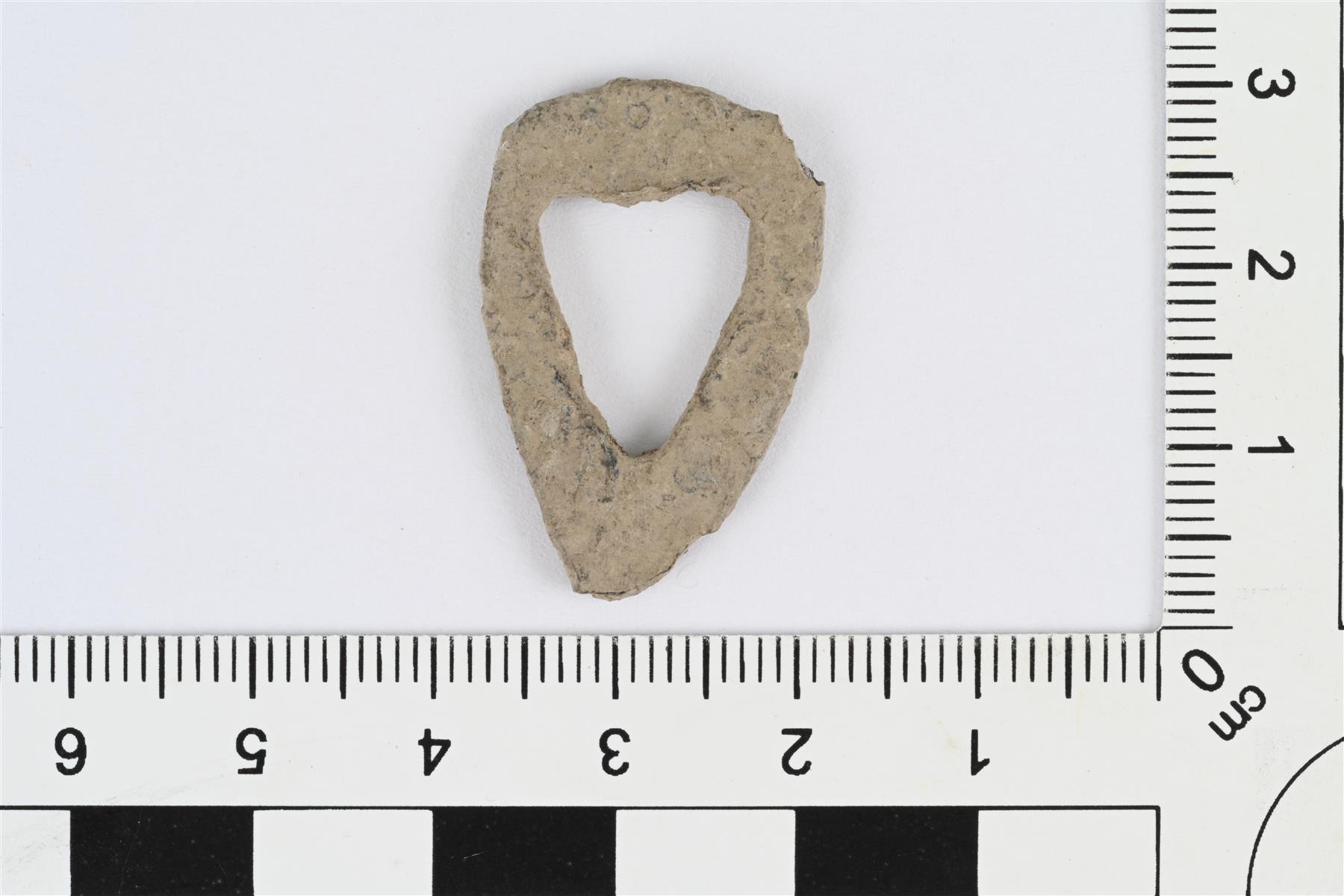 | Metalliesineen katkelma. Luultavasti tinaseosta. Pisaran tai pyöristetyn kolmion muotoinen litteä katkelma, jossa suuri kolmion muotoinen reikä. Kapea pää katkennut, myös leveän pään reunassa murtuma. | |