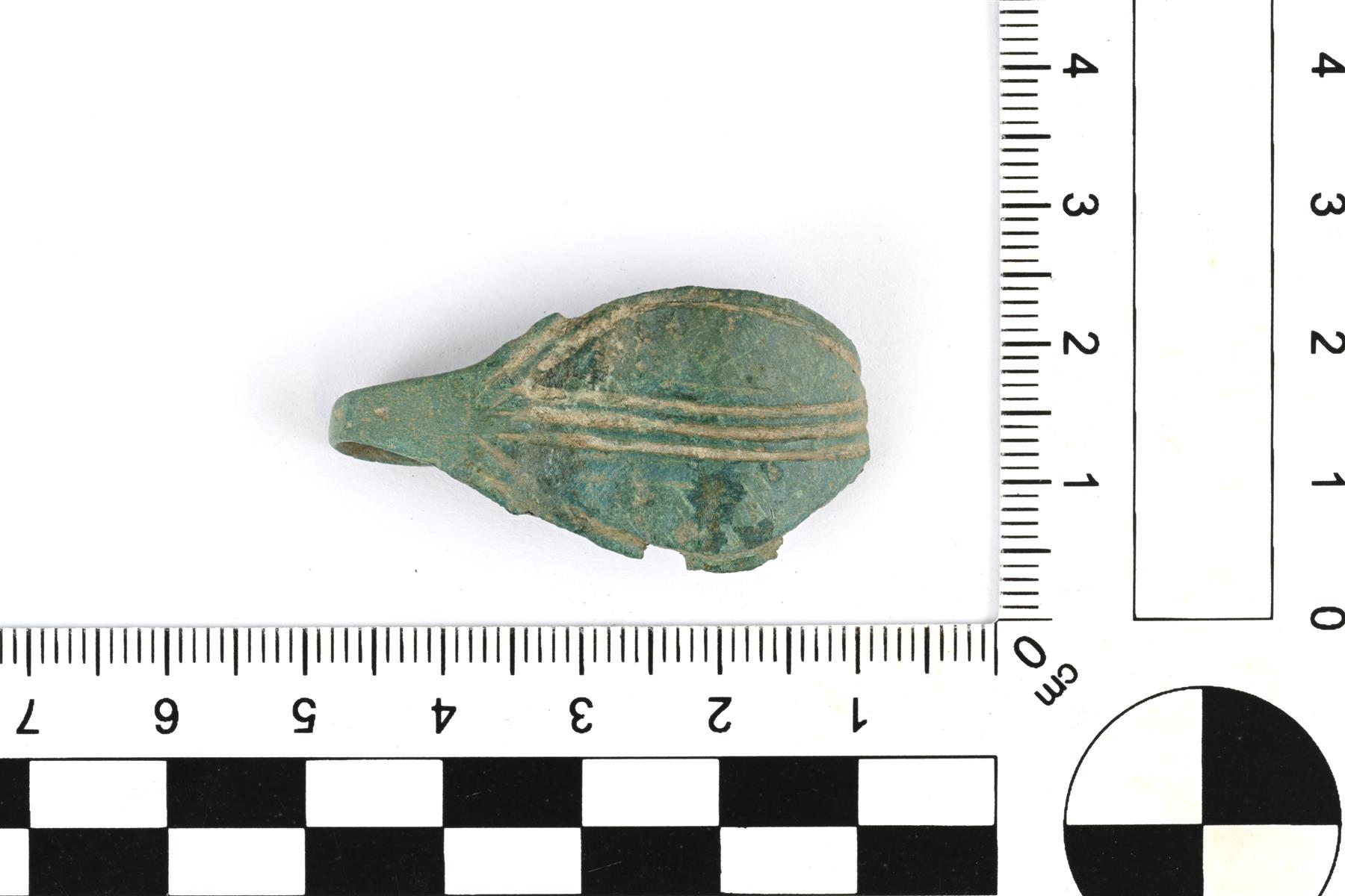 | Keskikilvellisen spiraalisormuksen katkelma. Kilpi on muodoltaan ovaali ja sen halki kulkee kolme viivauurretta. Reunoja kiertää kaksi viivauurretta. | |