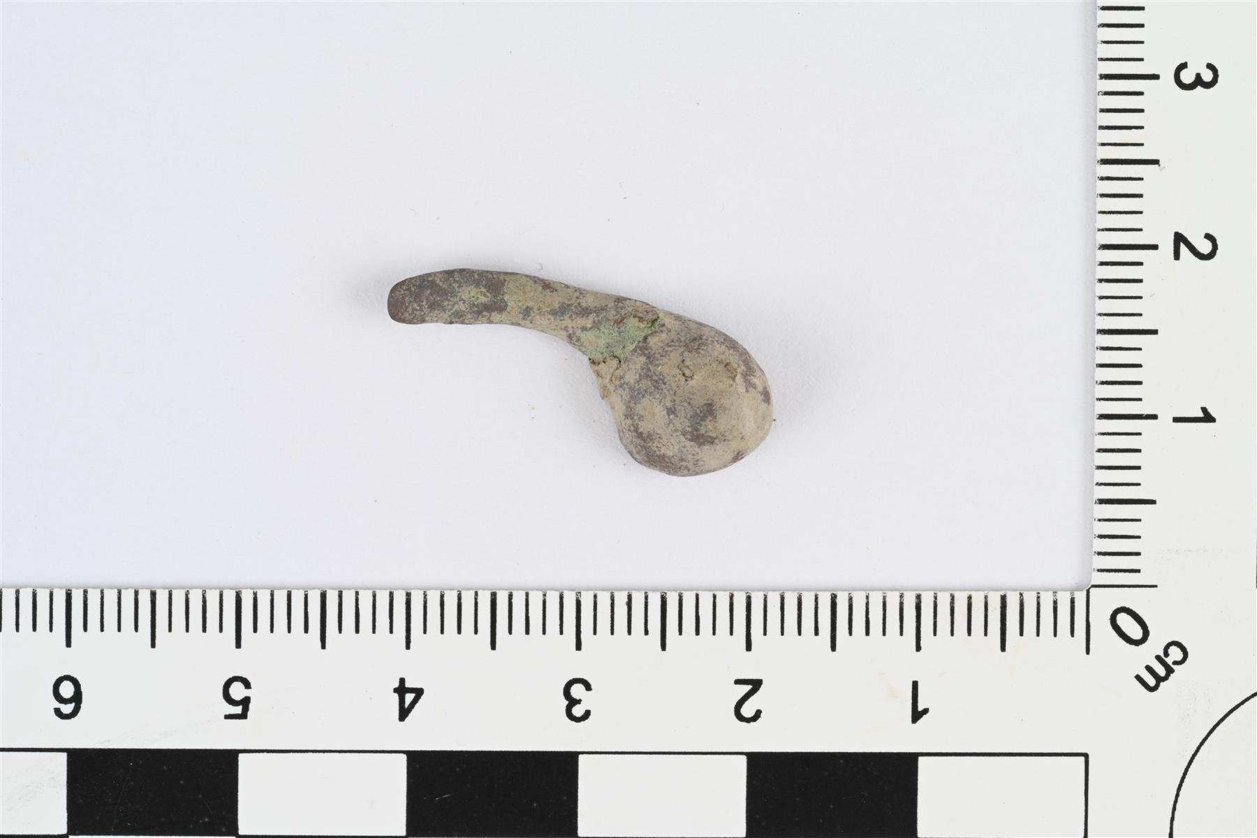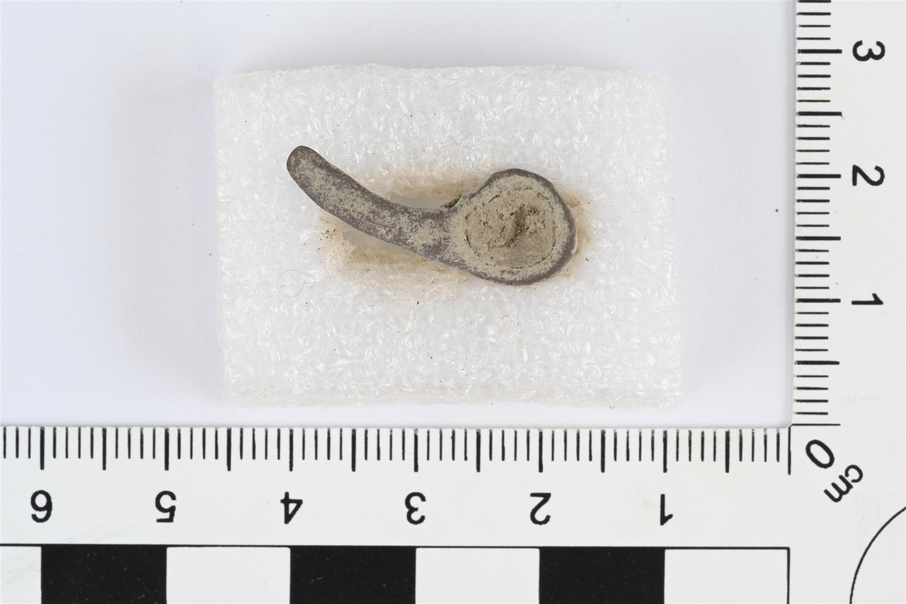 | Kupariseosesineen katkelma. Ohut varsi, jonka poikkileikkaus puoliympyrä. Toinen pää katkennut, toisessa päässä kartiomainen nuppi, jonka taustapuoli on kovera. | |
