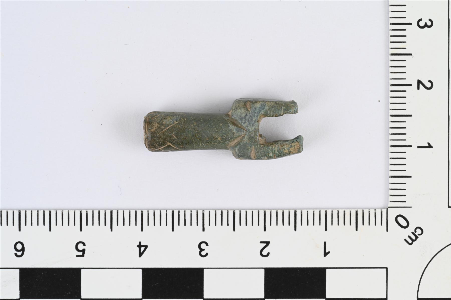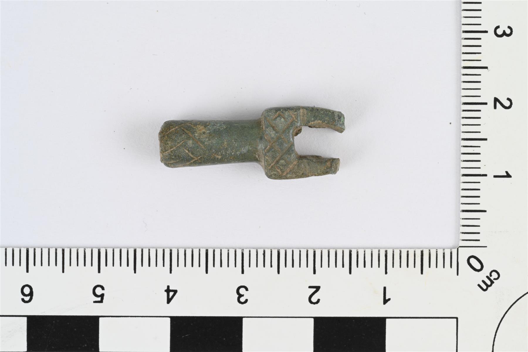 | Putkilukon avaimen katkelma. Katkelma poikkileikkaukseltaan pyöreästä varresta, jonka toinen pää levenee kaksihaaraiseksi ja poikkileikkaukseltaan suorakulmaiseksi. Pinnassa uurrettua koristelua: varressa kulmaviivakoristelua, suorakulmaisen osan toisella pinnalla vinoruudukkokuviota ja toisella pinnalla säteittäisiä viivoja. | |