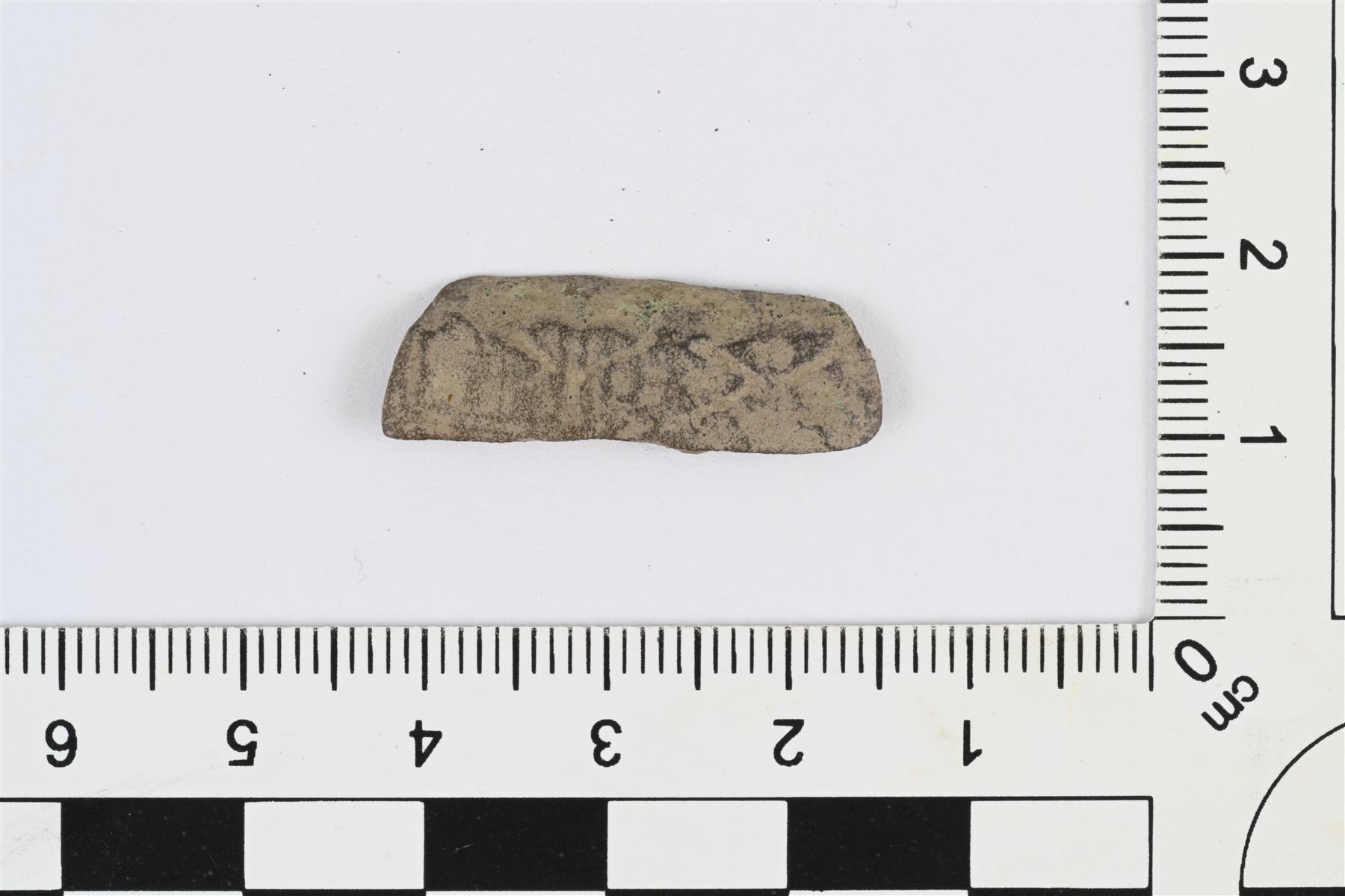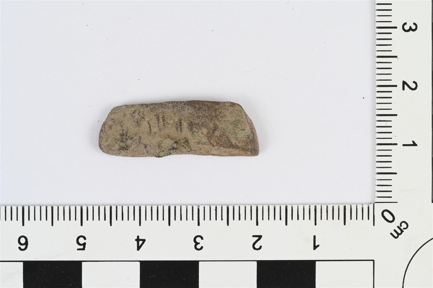 | Kupariseosesineen katkelma. Katkelma kulmista pyöristetyn suorakaiteen muotoisesta levystä. Molemmilla pinnoilla mahdollisesti koristelua. | |
