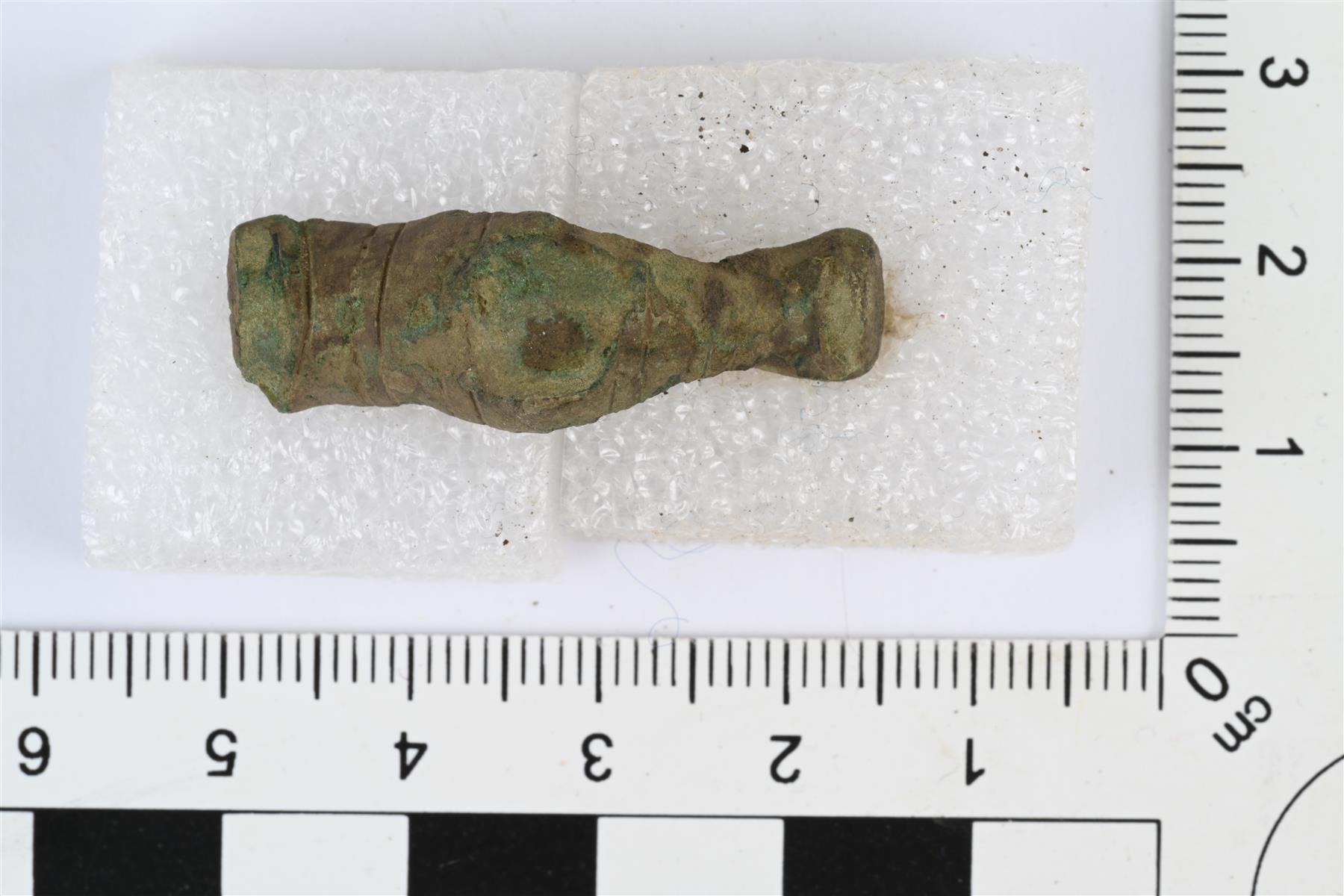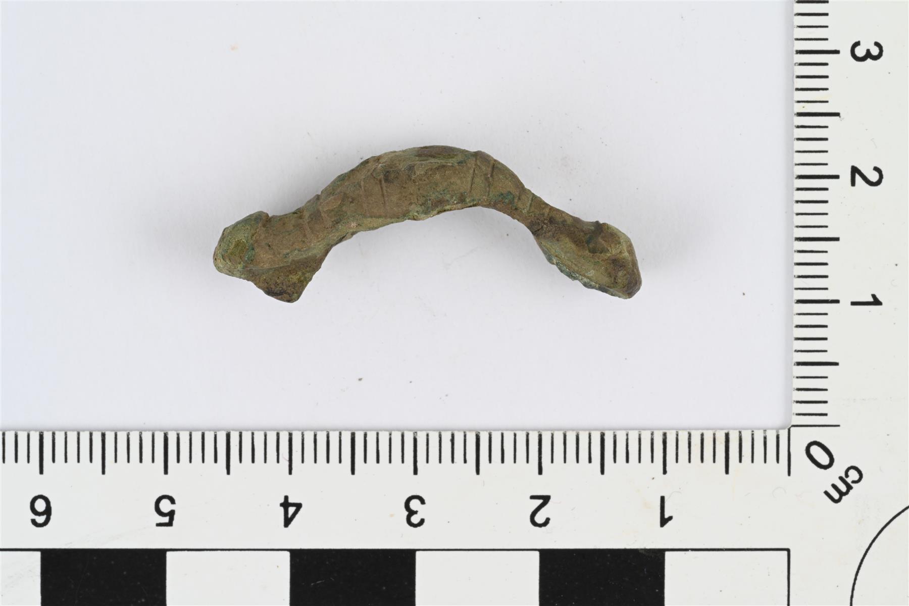 | Merovingiaikainen tasavartinen solki. Toinen pää toista selvästi kapeampi, leveydet 5-8 mm ja 9-10 mm. Koristeltu parittaisilla poikittaisilla viivauurteilla. Taustapuolella jousilaitteen jäänteet. | |