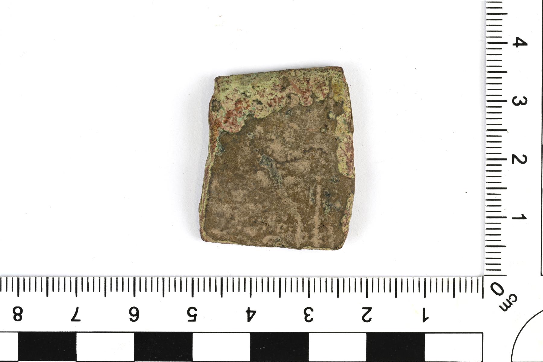 | Massiivisen rannerenkaan päätykatkelma. Levenee päätyä kohti. Pinta on melko kulunut, mutta siitä erottaa päädyssä olevia poikittaisia viivauurteita sekä jonkinlaisia leimakuvioita, joissa on kohopisteitä. Vastaa lähinnä Kivikosken tyyppejä Abb. 734 ja 735. | |