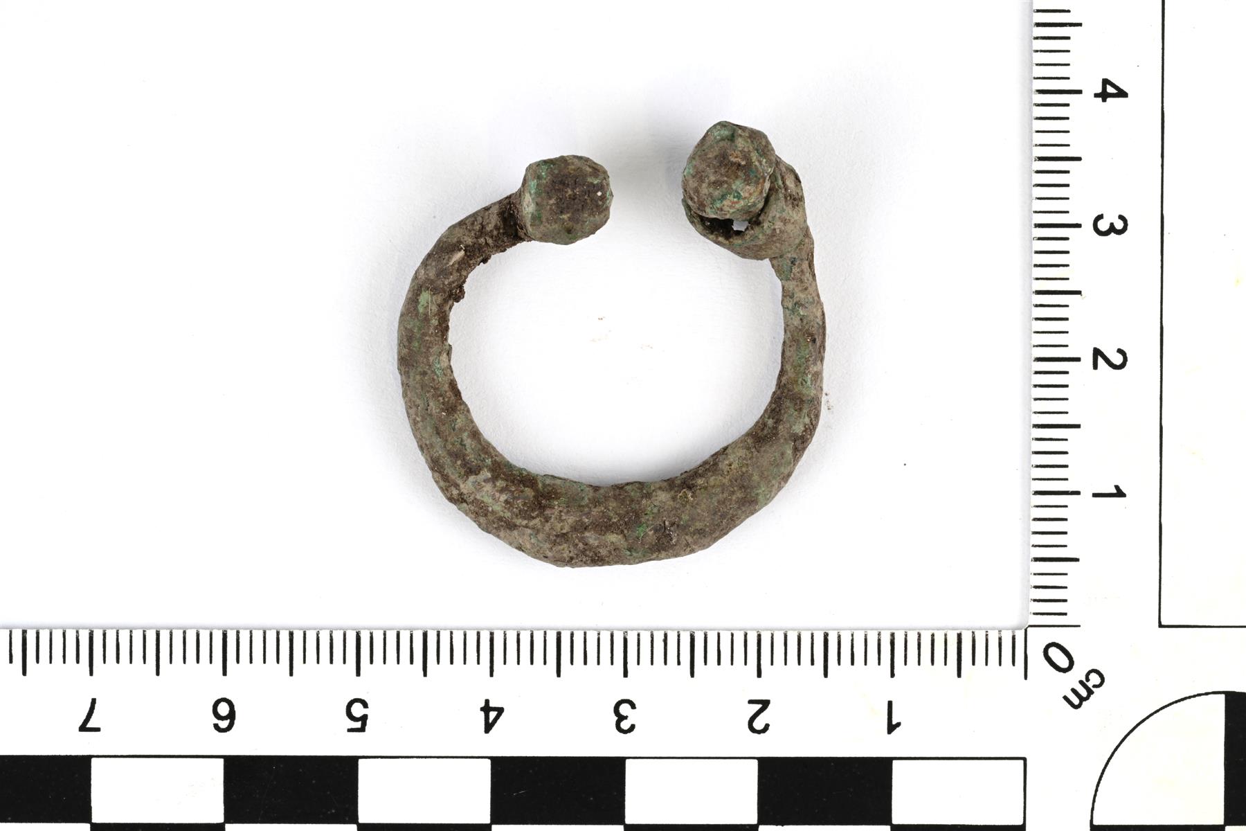Melko hyväkuntoisena säilynyt hevosenkenkäsolki. Neulasta on jäljellä kehän ympärille kierretty osa. Nupit ovat litteät ja muodoltaan melko pyöreät. Kehä on poikkileikkaukseltaan litteä vinoneliö. Vrt. Kivikoski Abb. 657. | |