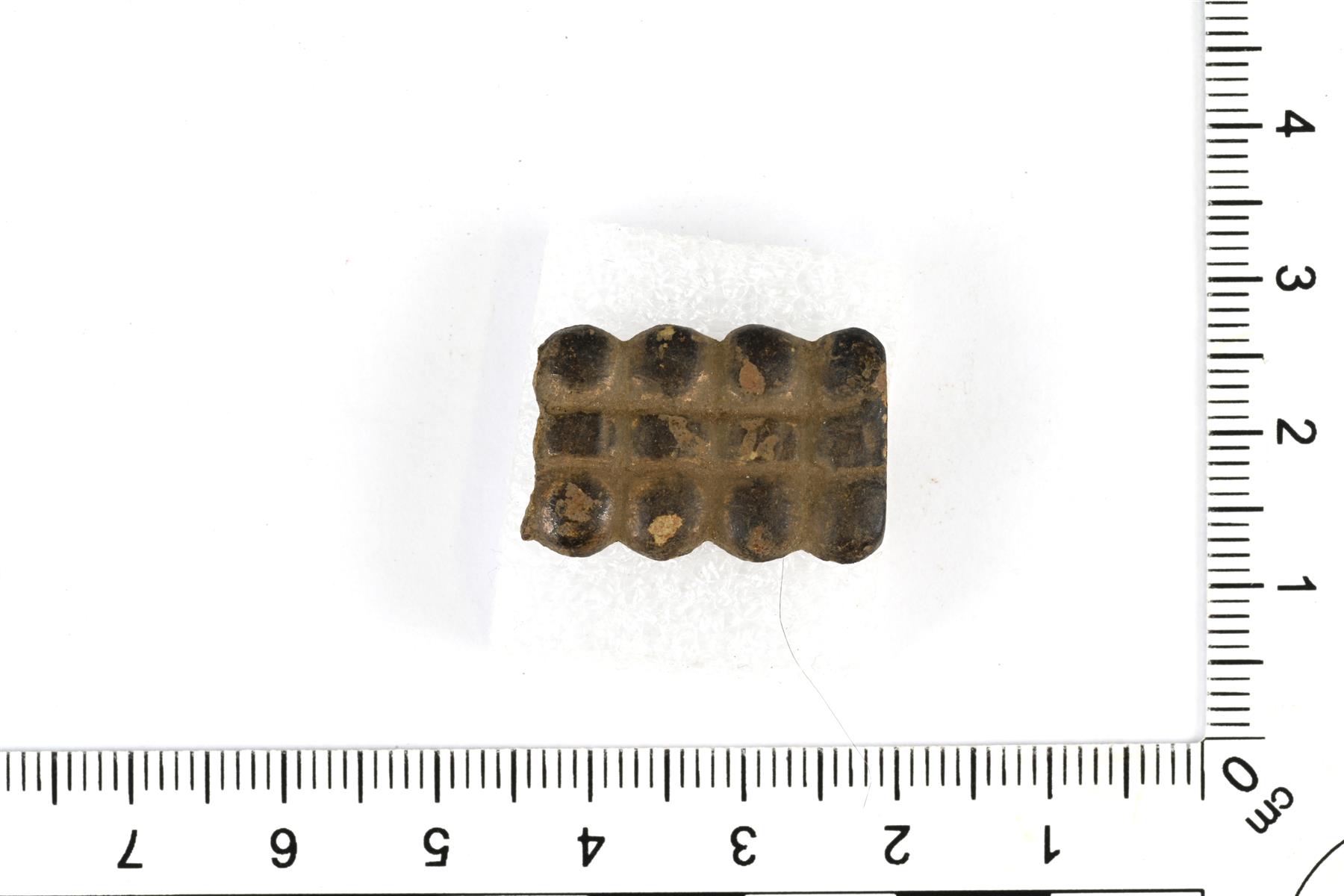 Suorakaiteenmuotoinen vyönhela. Koristeltu ruutuornamentiikalla. Taustapuolella on kiinnitysniitin jäänne. | |