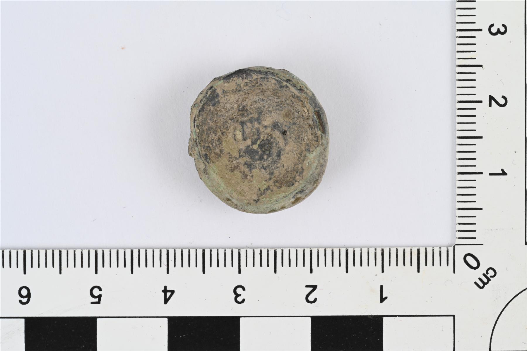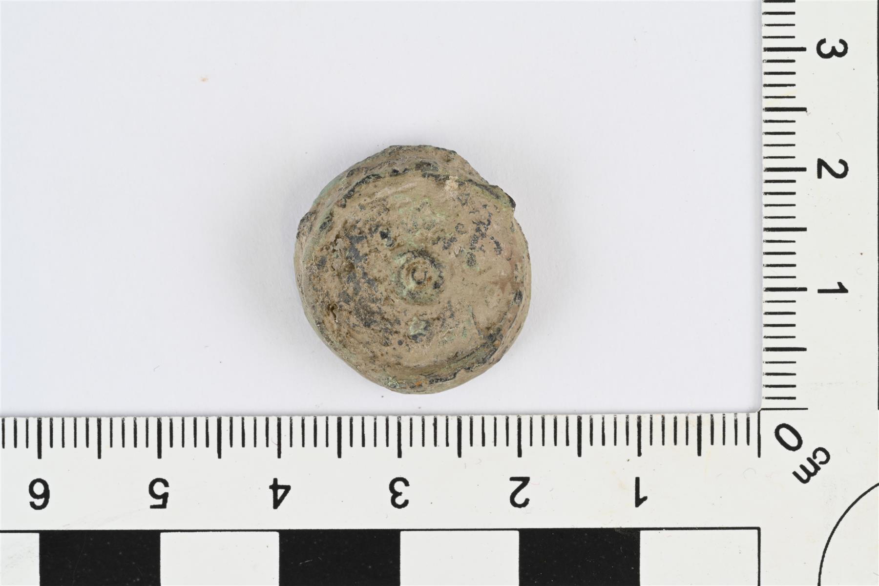 | Pyöreä korunappi, agraffinappi. Matalan katkaistun kartion muotoinen, sivut hieman koverat ja niissä mahdollisesti viivauurteita. Reuna osittain murtunut. Etupuolen keskellä pieni kohoympyrä, huonon kunnon vuoksi muuta koristelua ei erotu. Taustapuoli kovera. Hieman vääntynyt, pinnat voimakkaasti korrodoituneet. Vrt. Kivikoski 1973, Abb. 349. | |