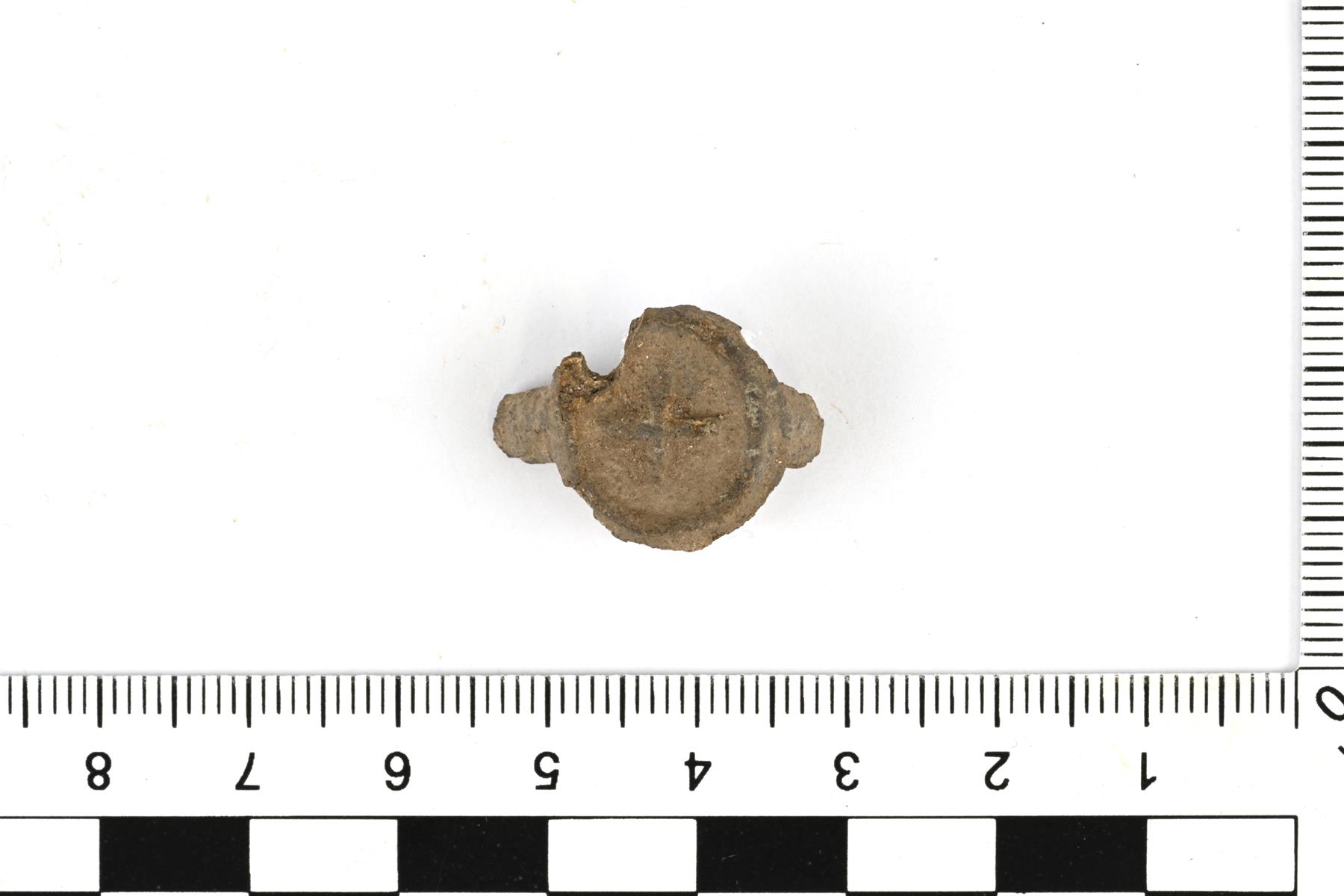 | Talonpoikaisen kantasormuksen katkelma. Kanta on muodoltaan pyöreä ja koristelty kohokuvioisella ristillä. | |