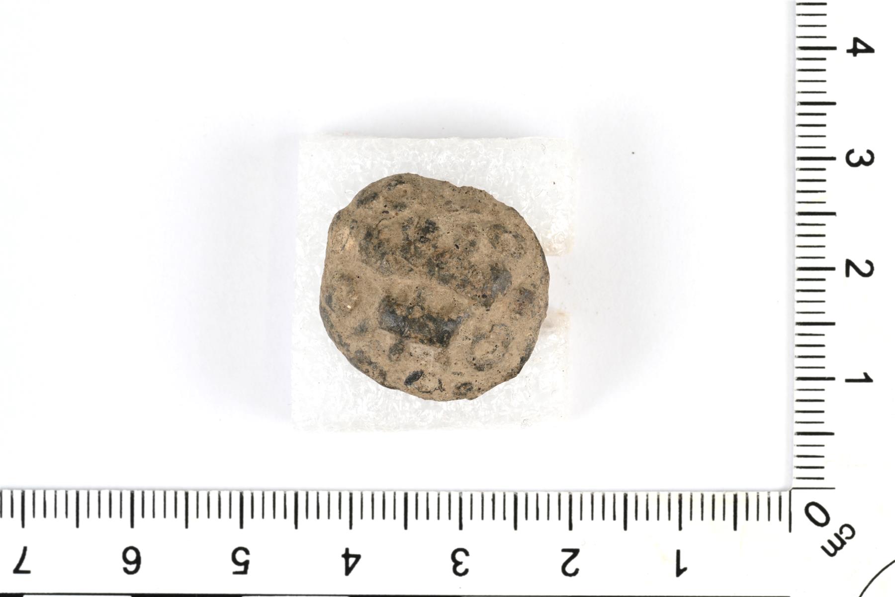 | Puolipallomainen vyönhela. Koristeluna kohokuviointia. Taustapuolella on kiinnistysniitin jäänne. | |