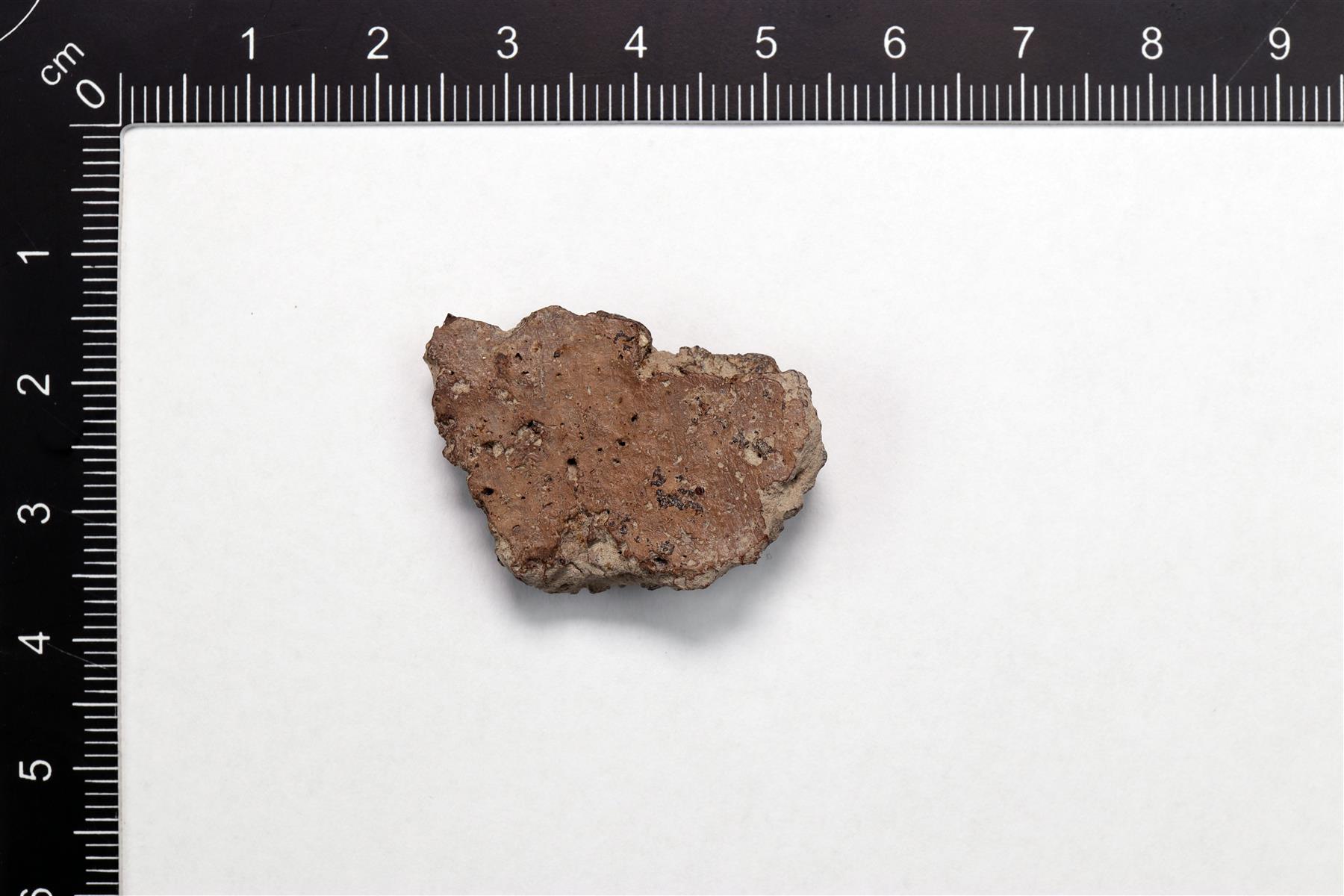 | Lohjennut saviastian pala. Saviaines on tummanharmaa, huokoinen ja orgaanissekoitteinen. | |