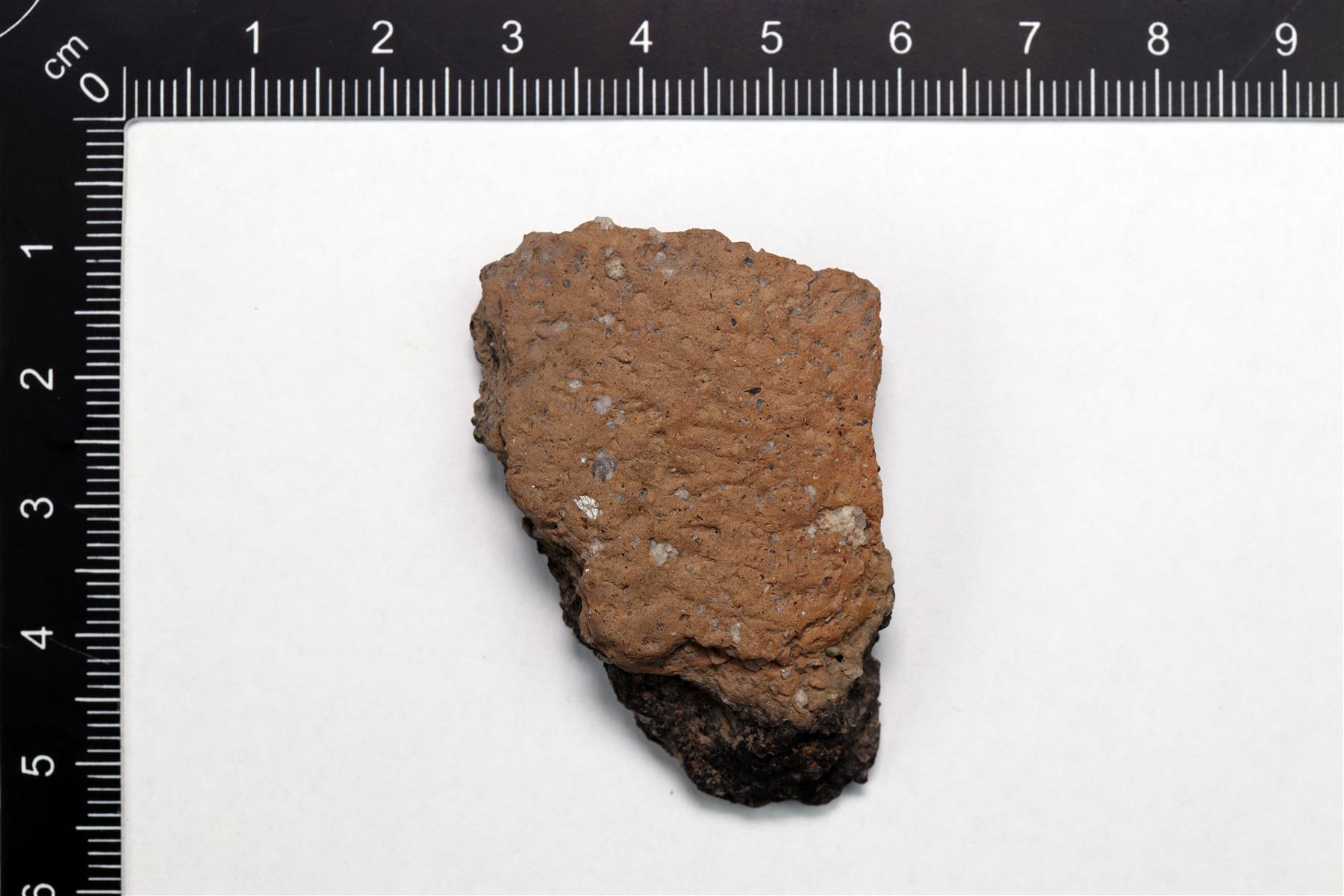 | Saviastian pala, jonka ulkopinnalla on tekstiilipainanne. Saviaines on karkea ja kivimurskasekoitteinen. Palan pinnat ovat ruskeita ja ydin tummanharmaa. | |