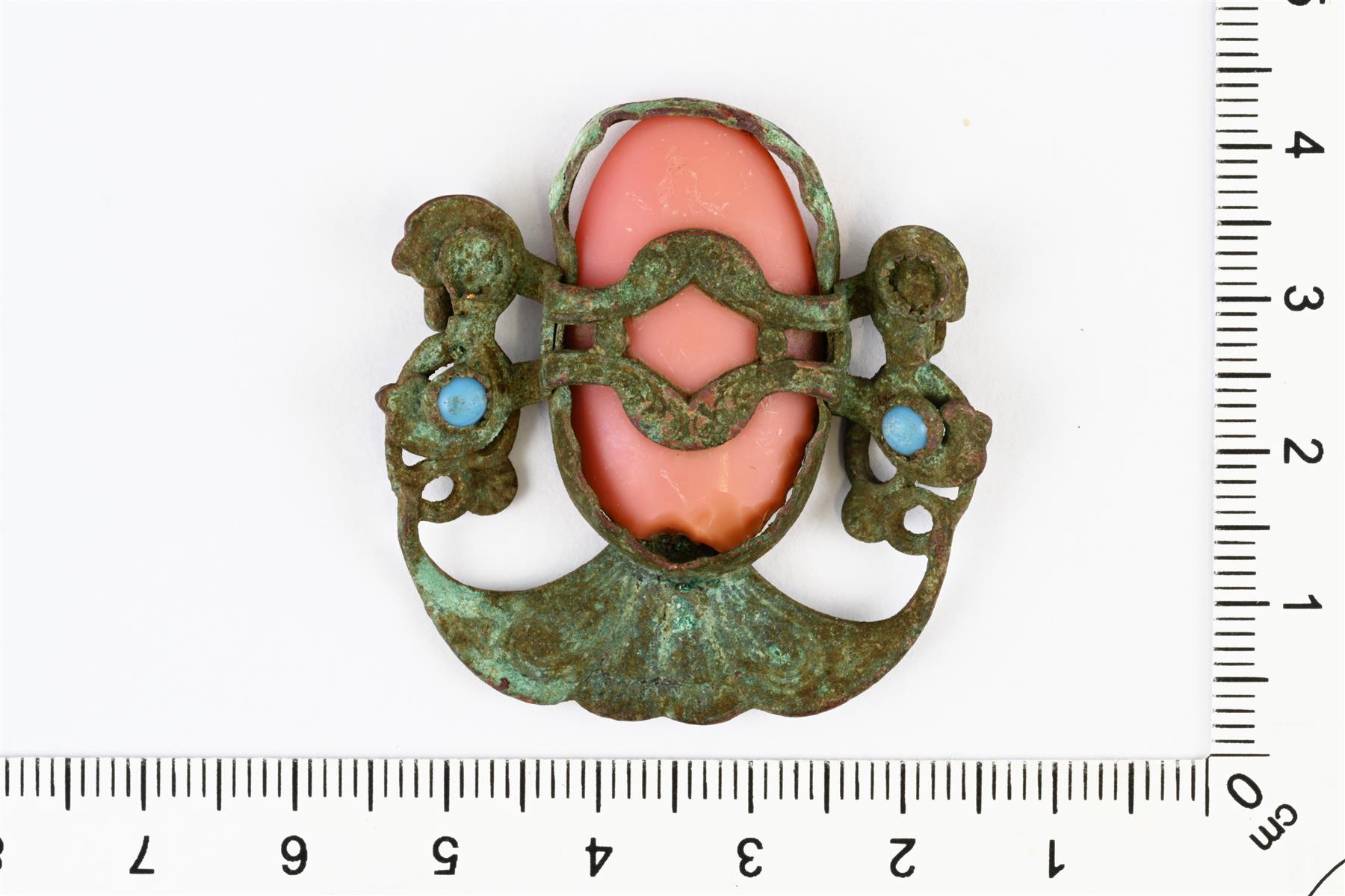 | Kasviornamentiikalla koristeltu rintakoru. Keskellä on vaaleanpunainen ja ovaalinmuotoiseksi hiottu korukivi. Sivuilla on neljä turkoosia ja pyöreäksi hiottua korukiveä. Kaksi näistä on hajonnut. Taustapuolella on kaksi koukkua. | |