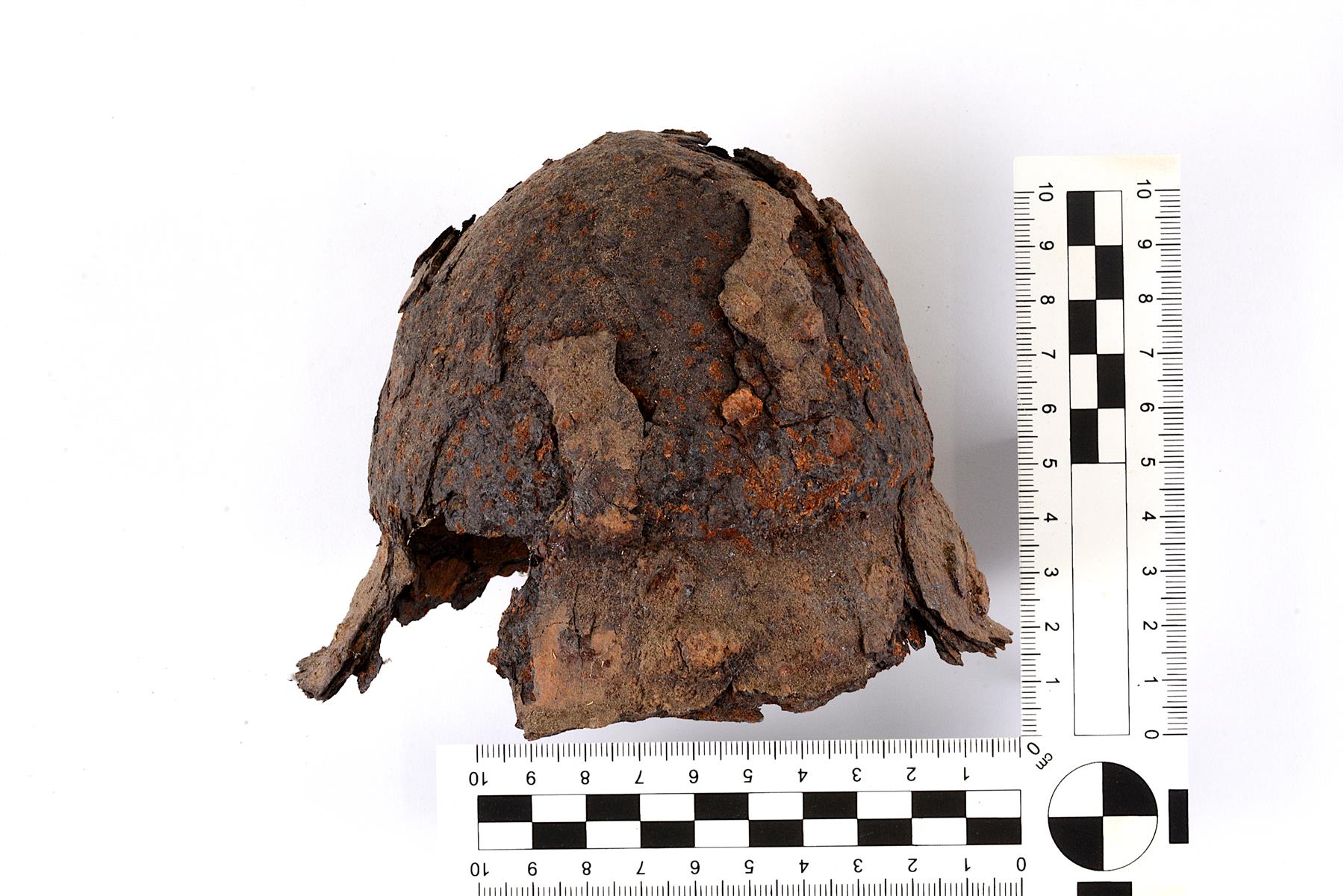 | Pyöreälakinen kilvenkupura. Reunus on hajonnut ja jäljellä on ainoastaan laki ja osia kaulasta. Kaulan ja laen liitoskohdassa on ulospäin levenevä taite, jolloin lakiosan tyvi on kaulaa hieman leveämpi. Pinnassa on paikoin haurasta korroosiokerrosta ja laella on halkeamia. Edustaa myöhäismerovingiaikaista kupuratyyppiä. Vrt. esim. Salmo (1952) kuva 199. | |
