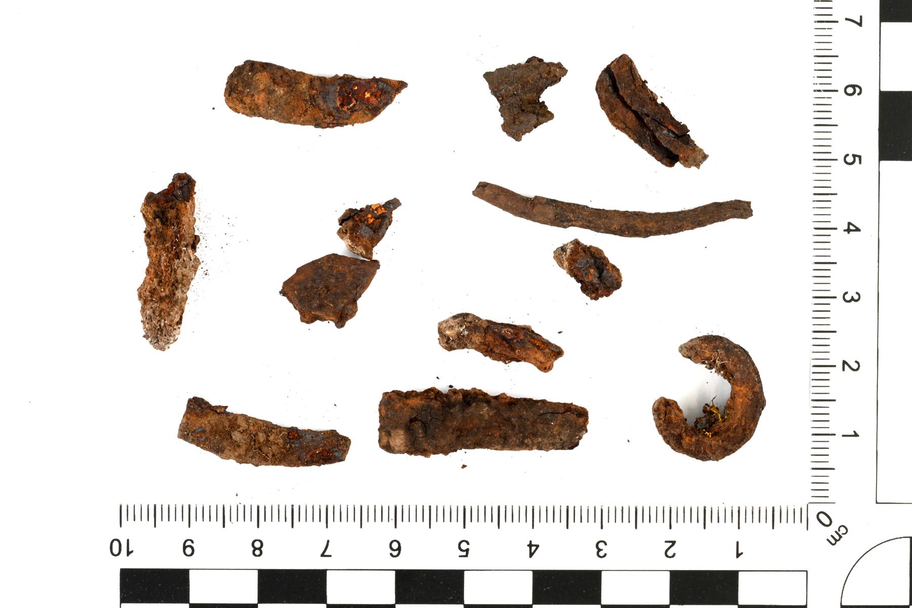 | Pieniä rautakatkelmia. Yksi on käännetty C-kirjaimen muotoon. | |
