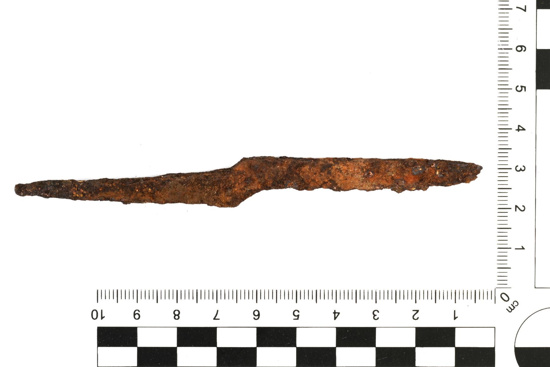 | Alaruotoinen veitsi. Hamara on suora ja terä on hyvin kulunut. Ruoto on lyhyt, joten kyseessä on piiloruotoinen veitsi. | |