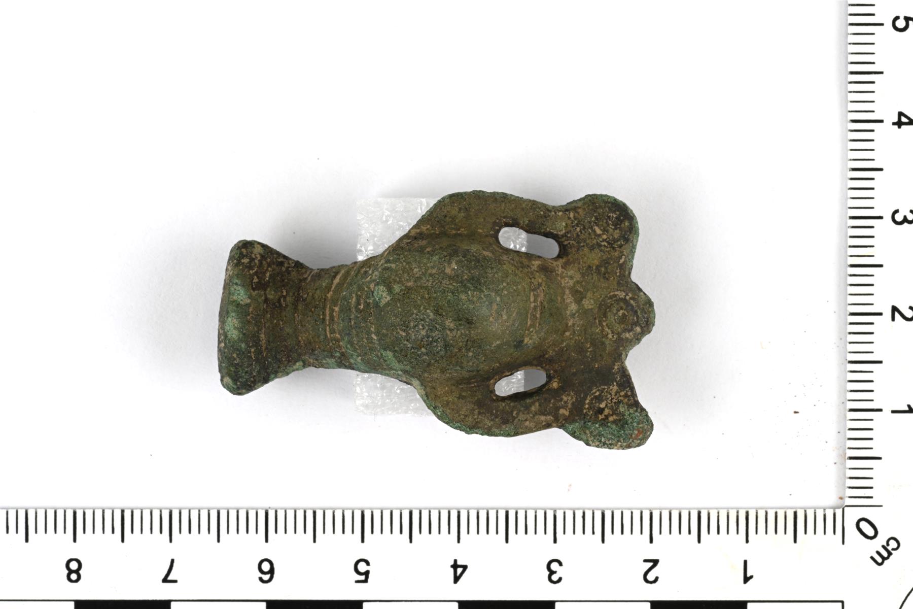 | Melko hyväkuntoisena säilynyt rapusolki. Päädyn toinen sivu on kulunut ja taustapuolella oleva jousilaitteen kiinnityslenkki sekä neulakota ovat hajonneet. Koristeluna helmiviivoja sekä häränsilmäleimoja. | |
