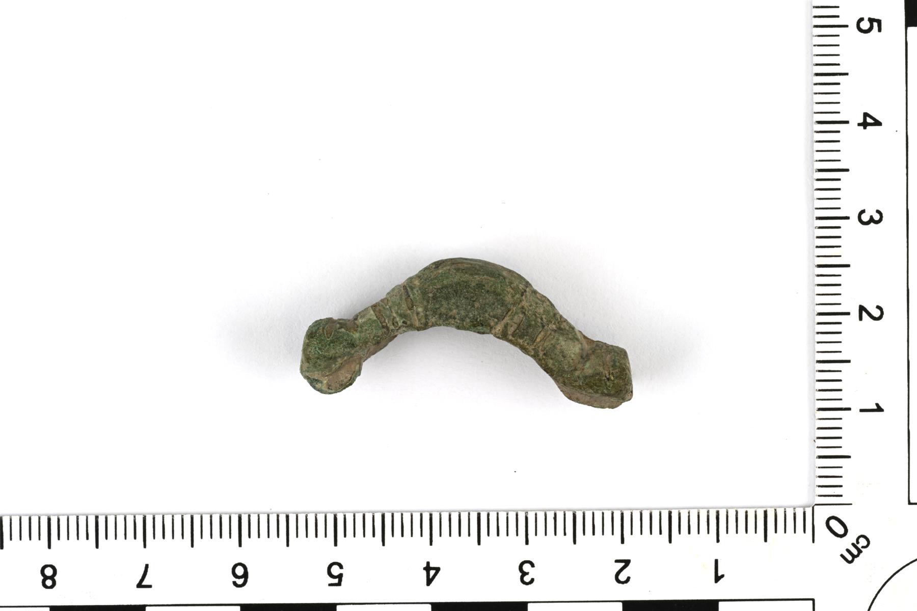 | Melkein kokonaisena säilynyt tasavartinen solki. Neulakota ja jousilaitteen kiinnityslenkki ovat hajonneet. Koristeltu viivauurteilla. Taustapuoli on keskeltä koverrettu. | |