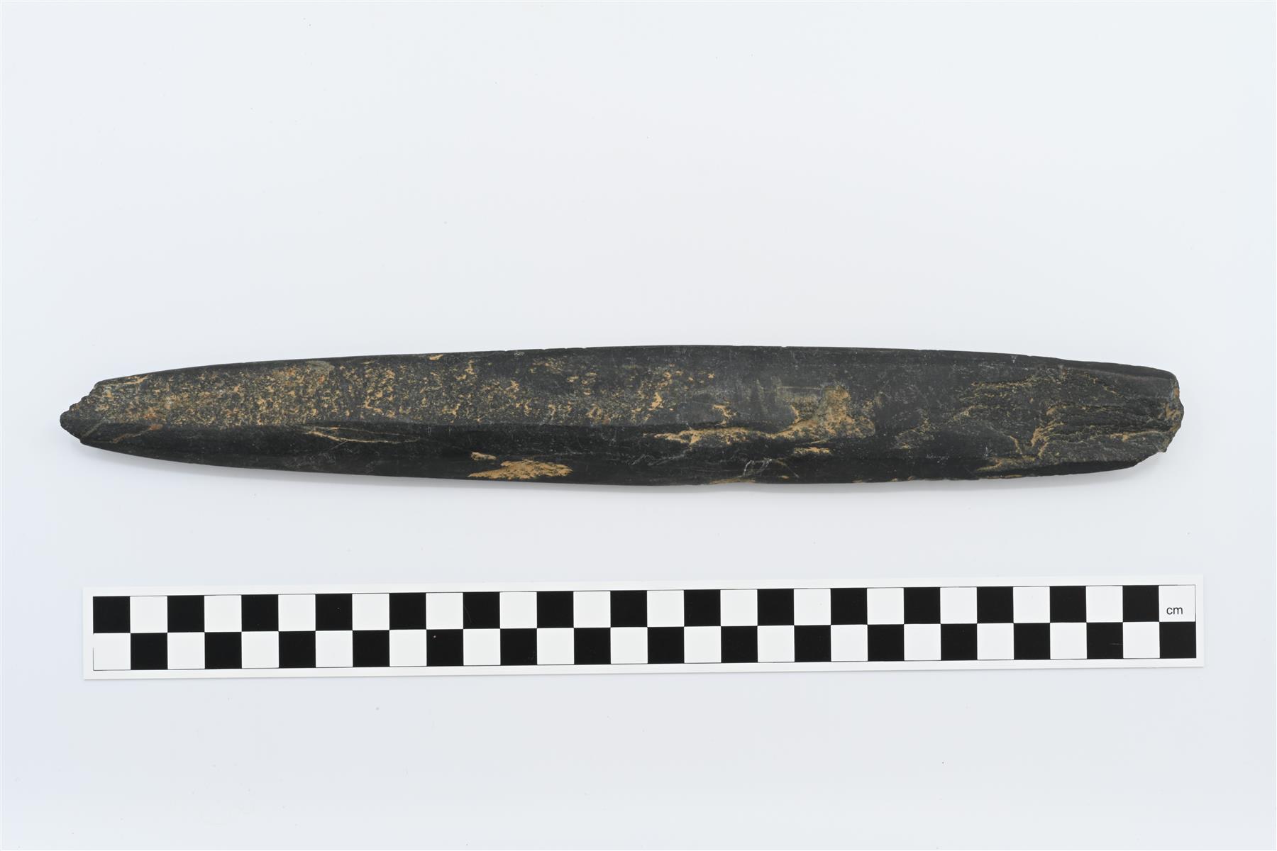 | Soikea keihäänkärki, tummanharmaata kiveä. Molemmista päistä murtunut. Lappeet osin hiotut. Poikkileikkaus epäsymmetrisen nelitahoinen. | |