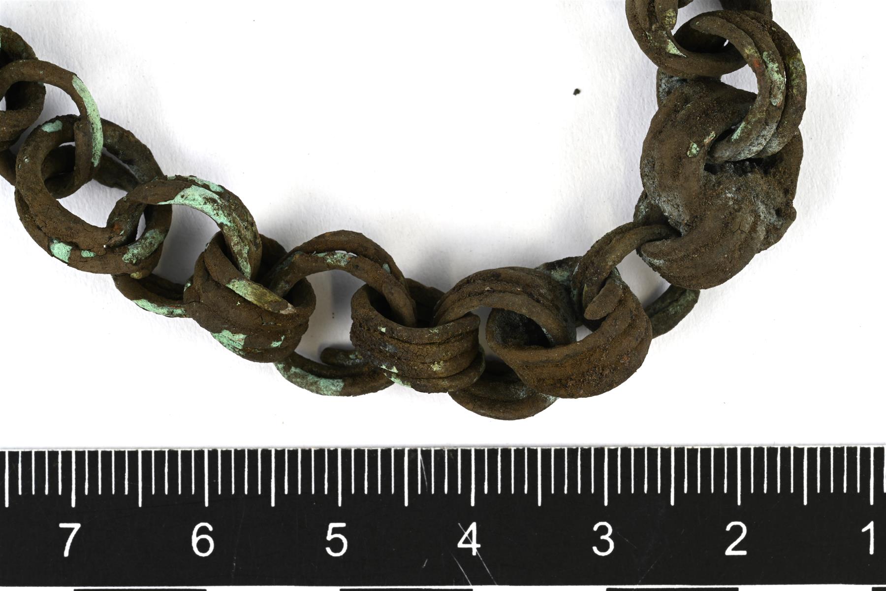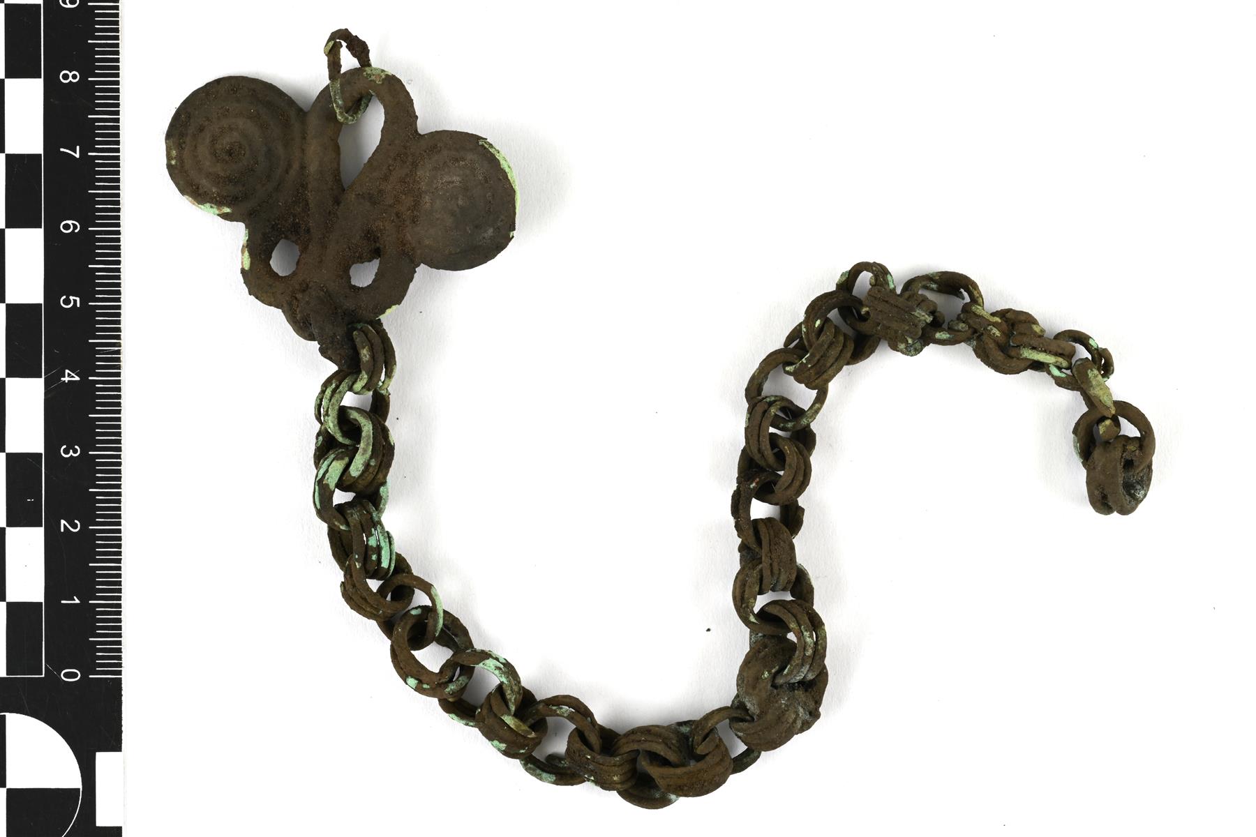 | Spiraalipäinen ketjunkantaja. Yläosassa olevassa ripustuslenkissä on yksittäinen kupariseoslenkki. Alaosan keskimmäiseen ripustuslenkkiin on kiinnitetty ketju. Ketju kaksi- ja kolme kertaa kierretyistä spiraalilenkeistä. Lanka on poikkileikkaukseltaan pyöreä ja lenkkien koko vaihtelee. Vrt. Kivikoski Abb. 767 ja 1110. | |