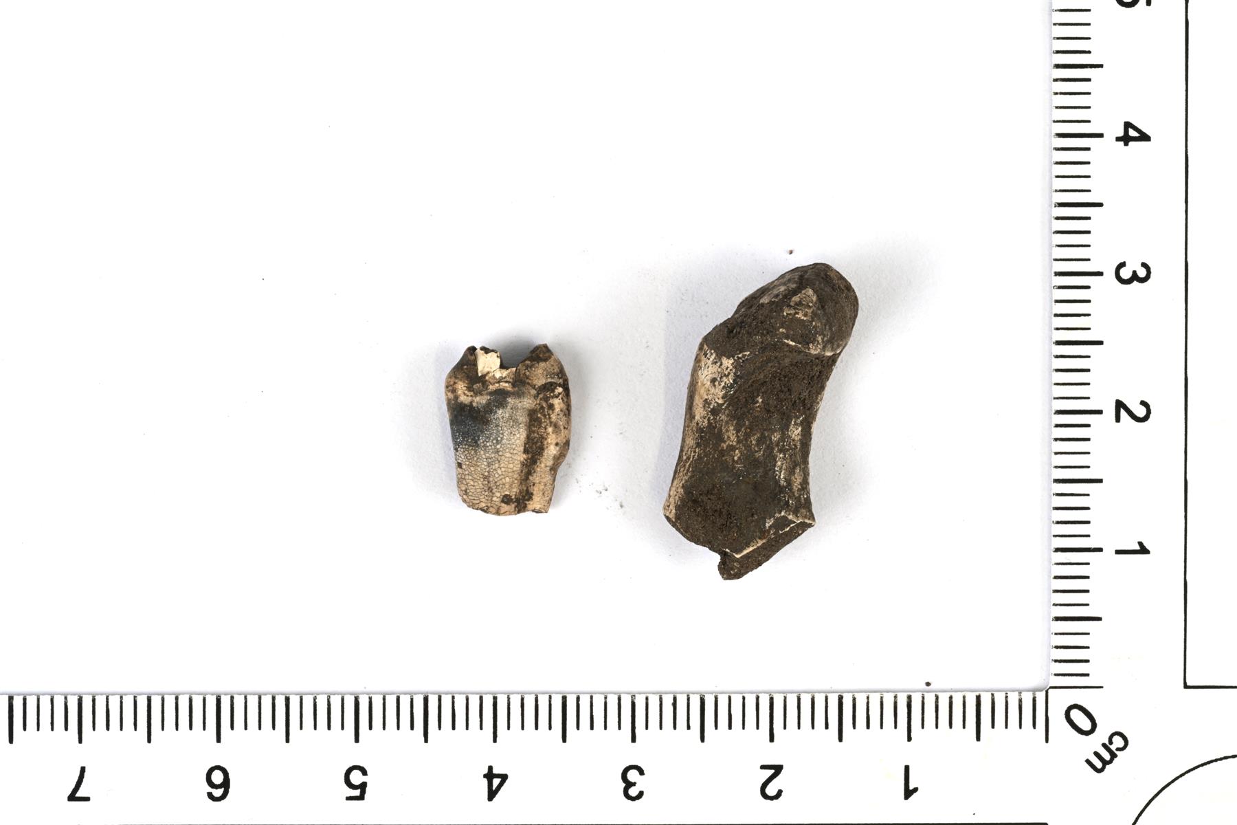 | Kaksi palaa palanutta luuta ihmisestä. Yksi on alaleukaluun vasen kondyyli ja toinen on todennäköisimmin poskihampaan juurikatkelma. Luut ovat palaneet korkeassa lämpötilassa ja niiden väri on murrettu valkoinen. Koon perusteella alaleukaluu on peräisin naisesta tai nuoresta yksilöstä. | |