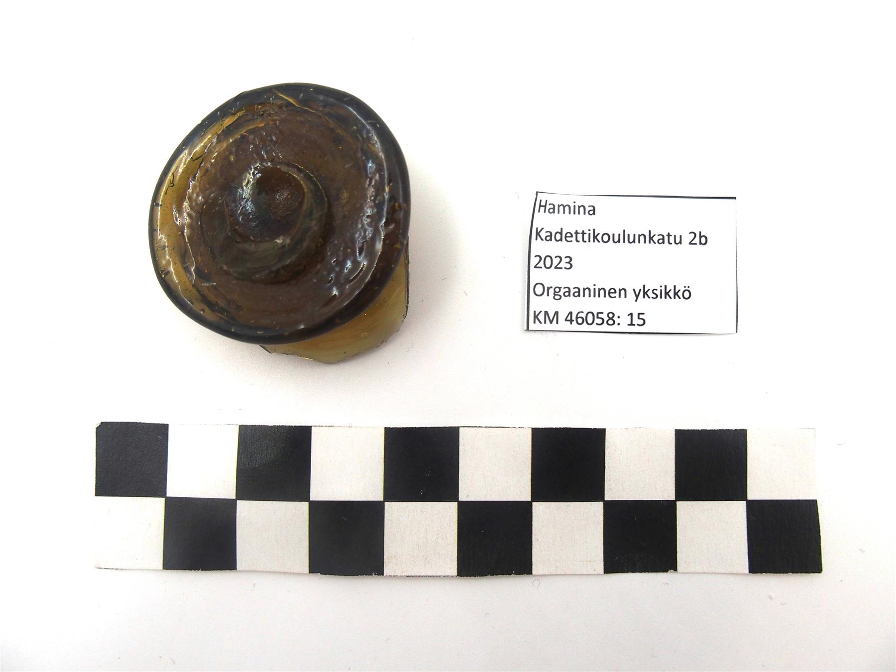 | Lasiesineen katkelma. Lasimassa vihertävän ruskeaa. Katkelma luultavasti osa jonkinlaisen koristeellisen juomalasin pohjaosaa. Lasimassassa havaittavissa kuplia. | |