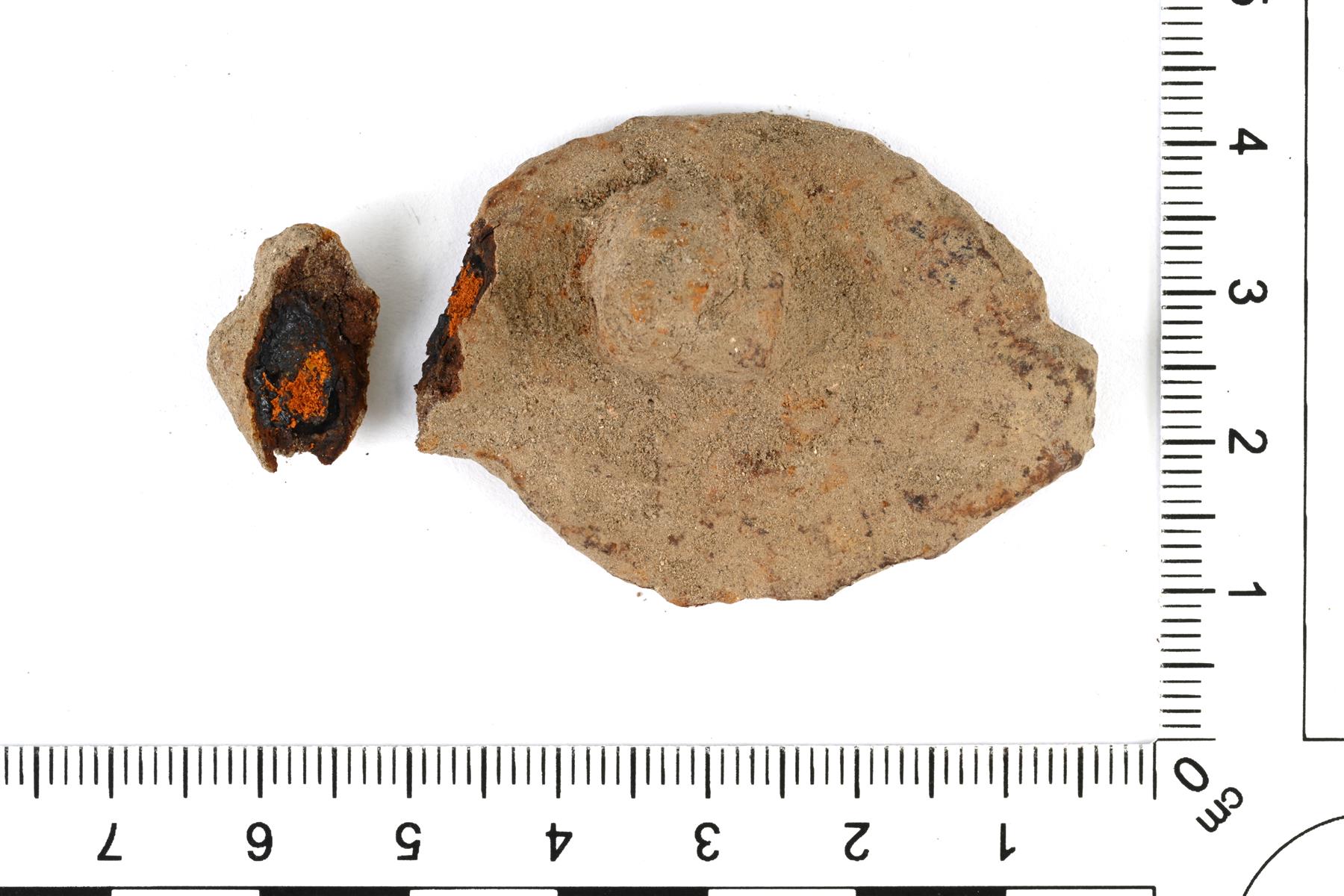 | Kaksipiikkisen viskarin pohjalevy ja pohjapiikki. Sivuilla olevat piikit ovat hajonneet. Pohjalevy on muodoltaan soikea. | |