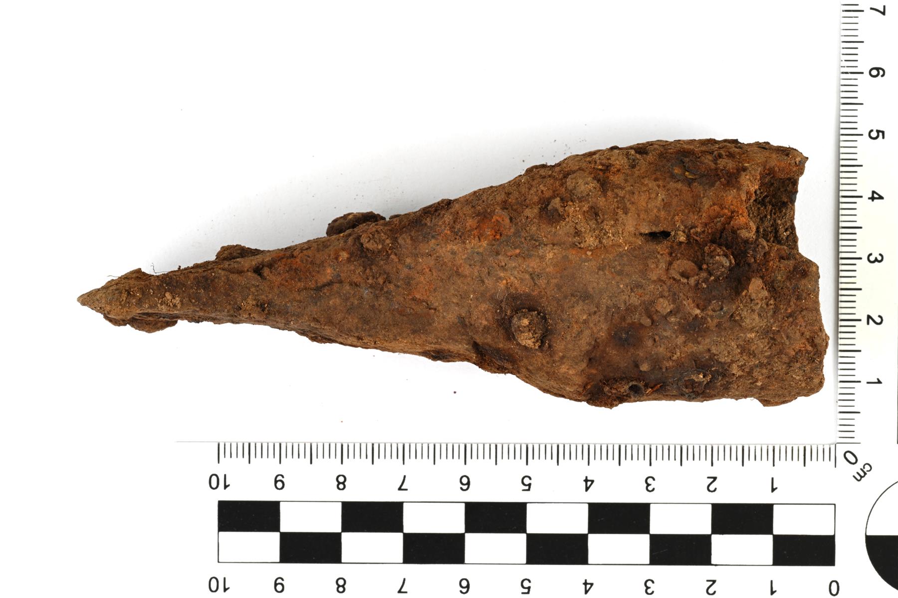 | Melkein kokonaisena säilynyt putkikirves. Teränsuu on kapea ja hieman kaareva. Putken reunasta on lohjennut palanen. Terän ja putken liitoskohdassa on kapea kaula. Putken poikkileikkaus on pyöreä ja sivulla on havaittavissa paikoin avonainen sauma. | |