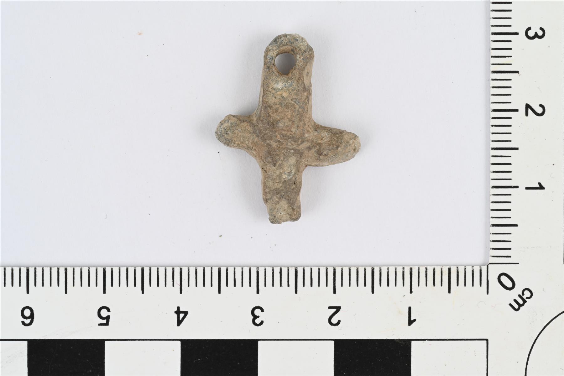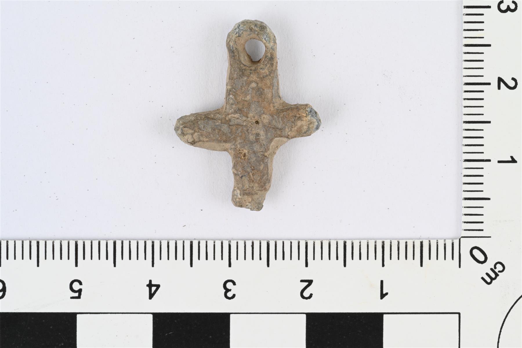 | Karkeatekoinen katkelmallinen ristiriipus. Lyijyä tai lyijyseosta. Ylin ristivarsi ehjä ja sen päässä reikä, muut ristivarret katkelmalliset. Toisella pinnalla keskellä, ristivarsien yhtymäkohdassa monisakarainen painauma, joka mahdollisesti koristelua tai valmistuksessa syntynyt jälki. | |
