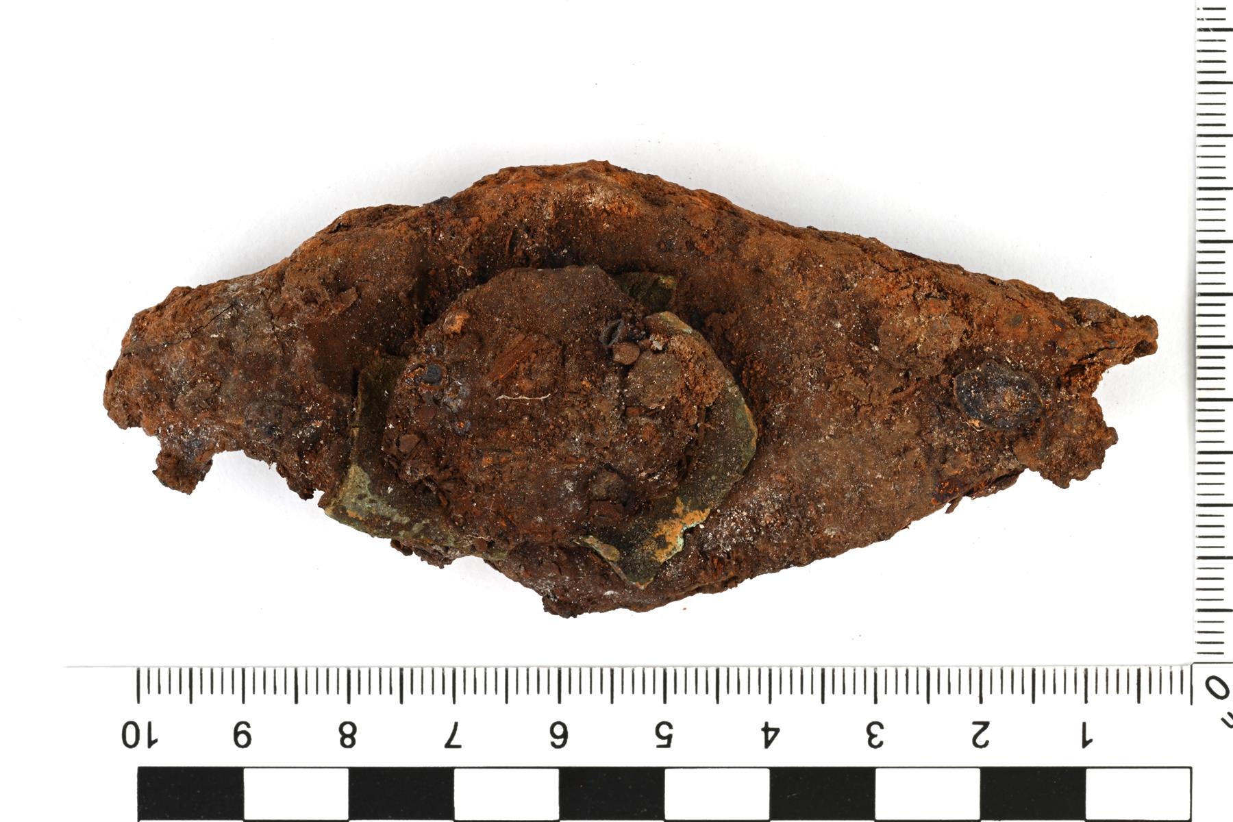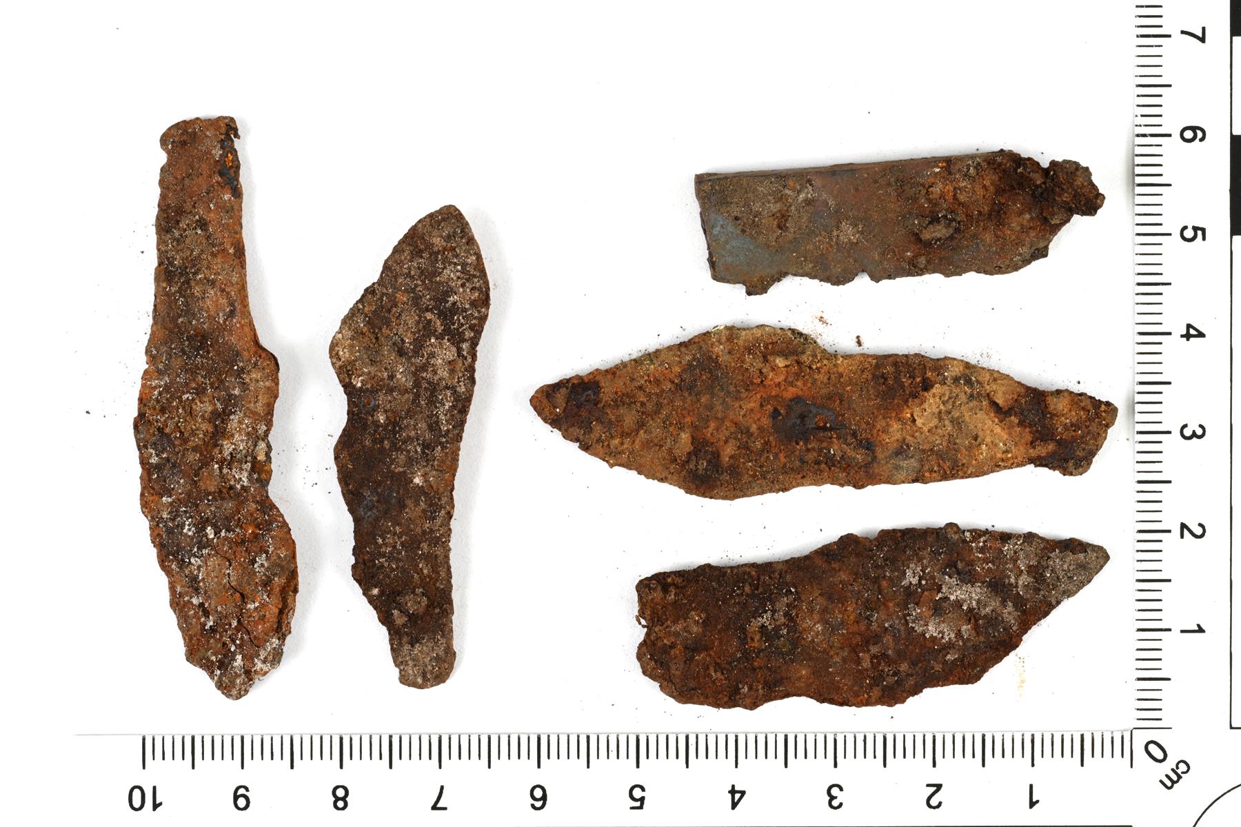 | Raudan katkelmia. Isoin katkelma on rombinmuotoinen kappale, jonka keskellä on niitti ja kupariseoksesta tehty niitin aluslevy. | |