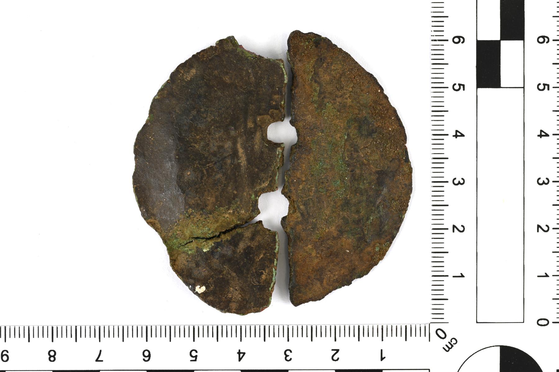| Kahteen osaan katkennut pyöreä levy. Keskellä on kaksi reikää. Melko karkeatekoinen. Mahdollisesti hela. | |