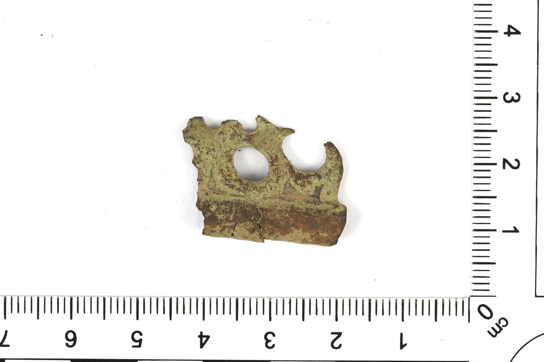 | Neulakotariipuksen katkelma. Alaosassa on jäänne neulakotelo. Yläosan reuna on hieman kaareva. Koristeluna puhkonaisia kuvioita. Vrt. Kivikoski Abb. 784. | |