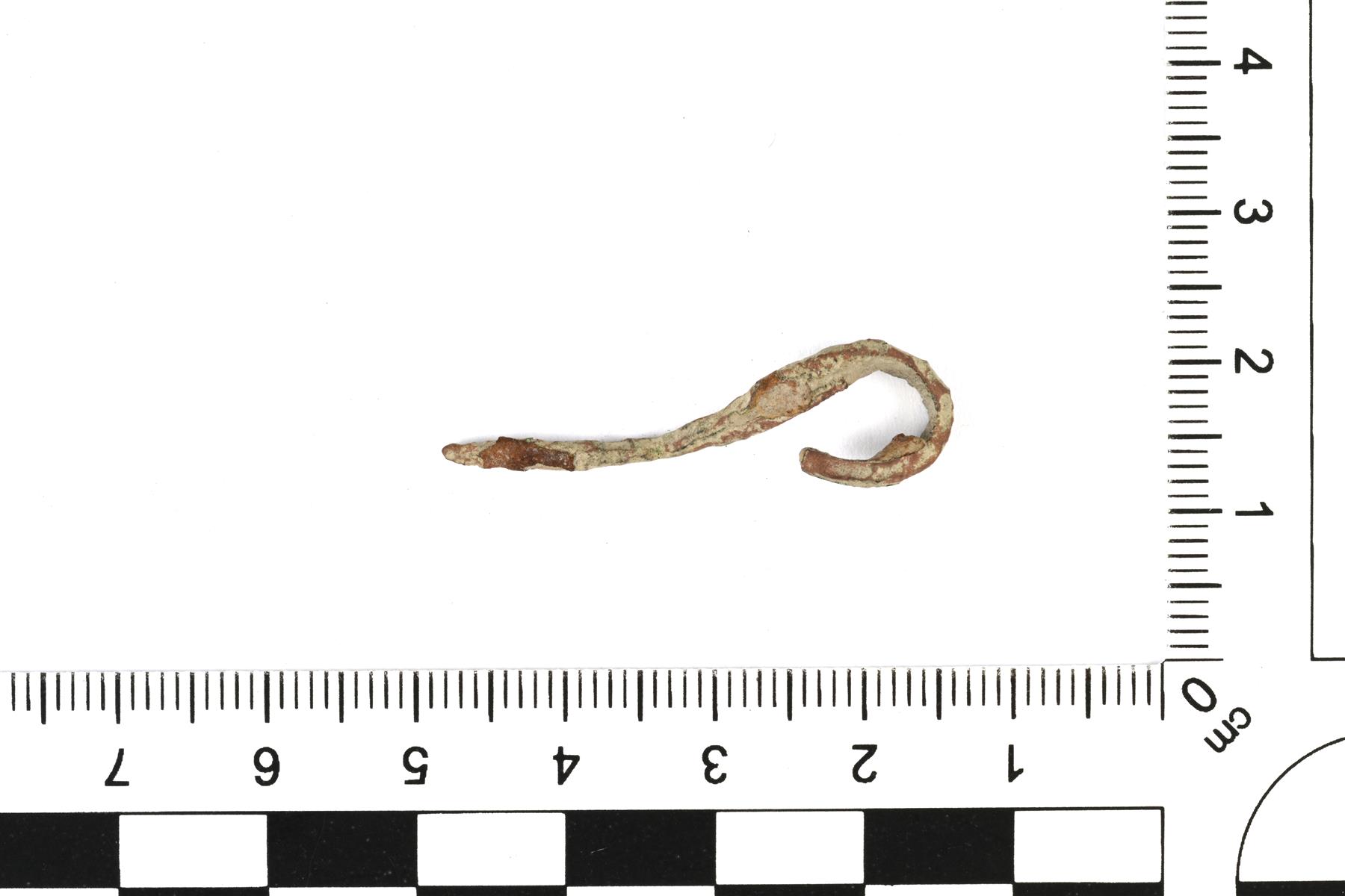 | Toisesta päästä vääntynyt kupariseosneulan katkelma. | |