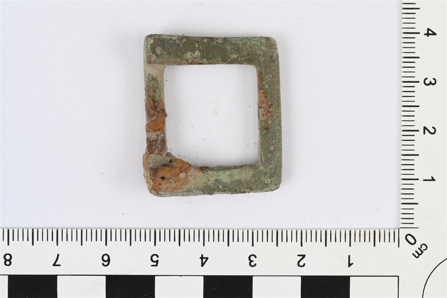 | Suorakaiteenmuotoinen vyönsoljen kehä. Toinen pitkä sivu eri tasossa muun kehän kanssa, tässä sivussa raudan korroosiota mahdollisesti rautaisesta neulasta. | |