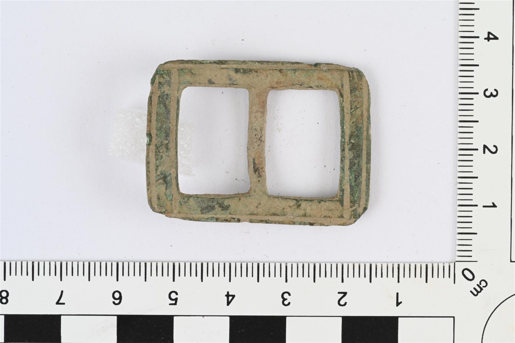 | Suorakaiteenmuotoinen vyönsoljen kehä, jonka keskitanko jakaa kahteen osaan. Kehä sivusta katsoen hieman kaareva, etupuolelta kovera. Kehä litteää varrasta, keskitanko poikkileikkaukseltaan pyöreä. Etupuolella reunojen myötäisiä suoria viivauurteita. | |
